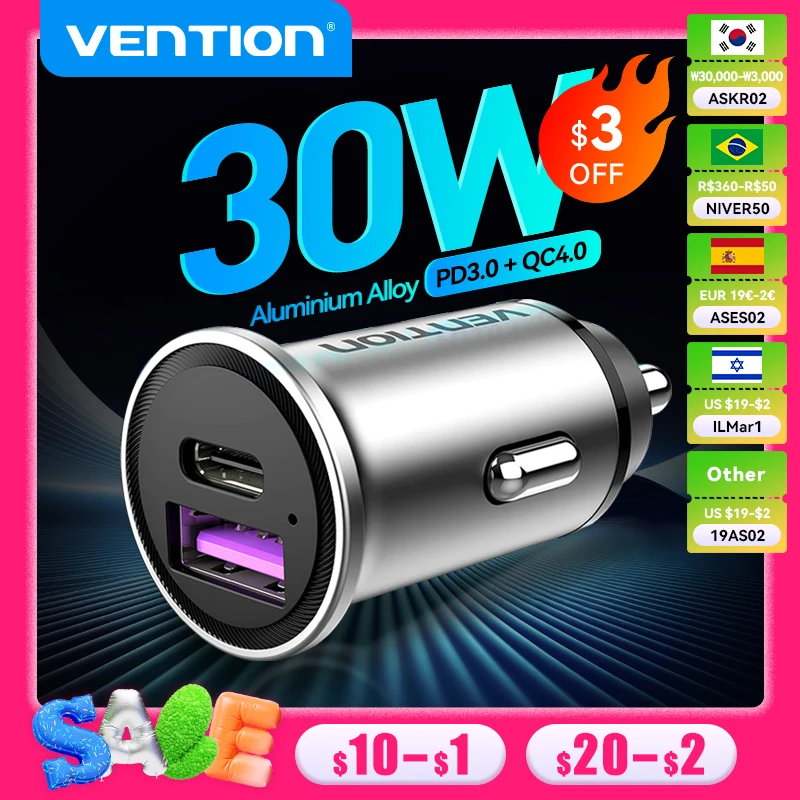 Comprar Cargador de coche Vention de carga rápida SCP QC4.0 QC3.0 USB tipo C PD carga rápida de coche para Xiaomi Huawei iPhone Samsung cargador de teléfono