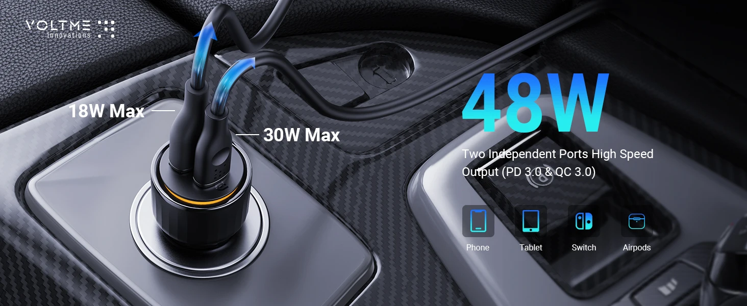 Voltme Cazo48CA admite carga PPS PD3.0 QC4.0, PD puede alcanzar una salida de 30 W, QC puede alcanzar una salida de 18 W.