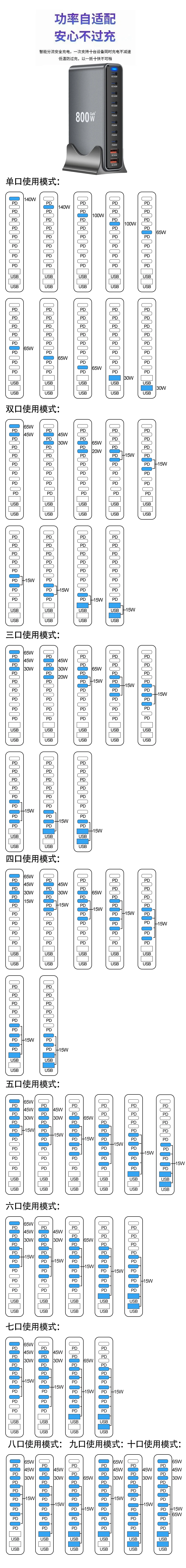 Cargador de suministro de energía GaN de 800 W Hub de carga ultrarrápida de 10 puertos 3.0 (8C2A): diseño compacto para teléfonos inteligentes, tabletas y computadoras portátiles