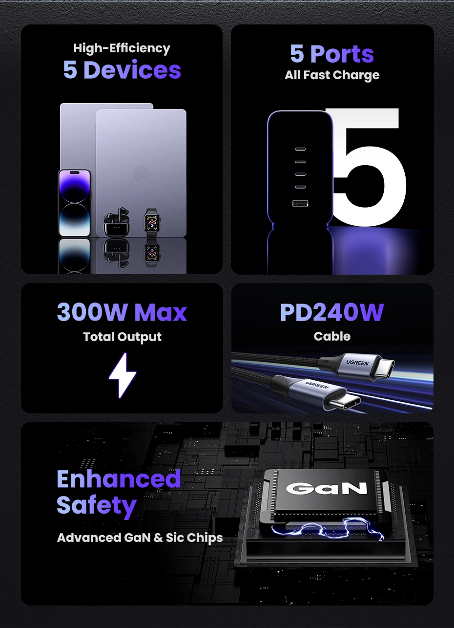 Compacto y de construcción sólida. Se incluye un cable USB C 240. Cubre todas mis necesidades de carga rápida cuando estoy en mi escritorio (laptop, teléfono, tableta, con ranuras adicionales de sobra). El embalaje está bien realizado y protege adecuadamente los productos.