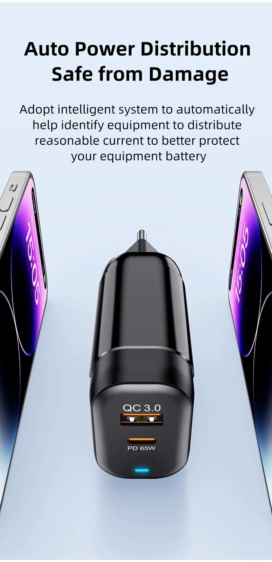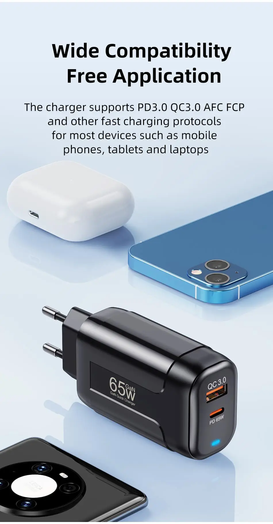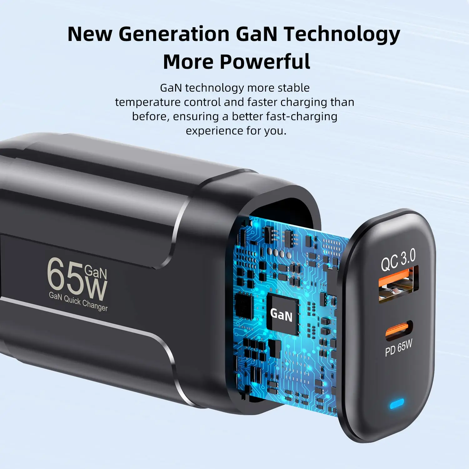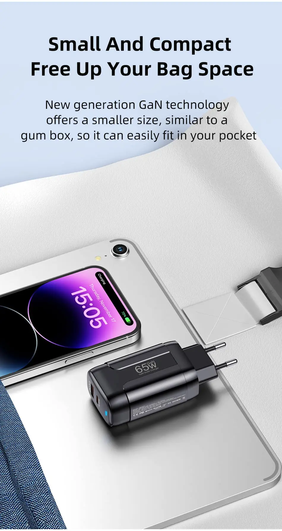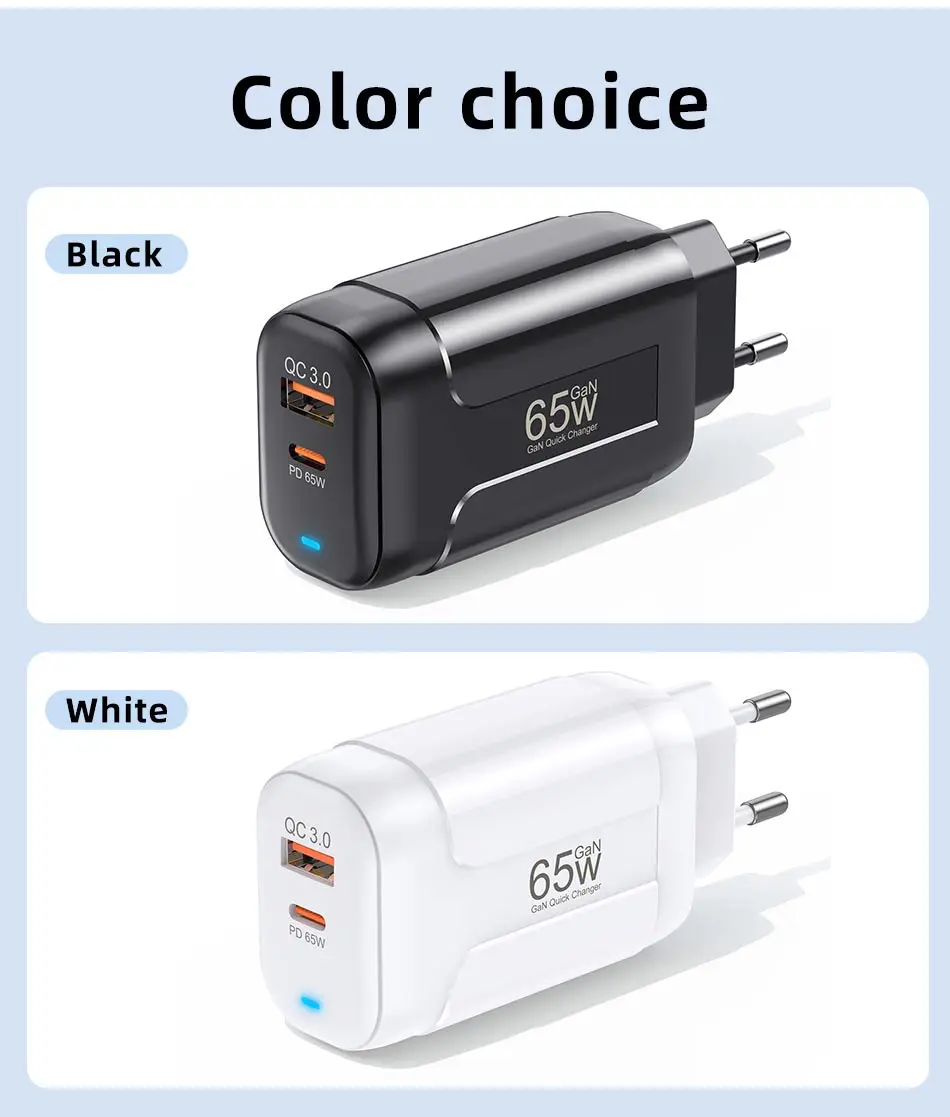 Comprar Cargador GaN USB tipo C de carga rápida, 65W, PD, QC3.0, KR, enchufe de la UE y EE. UU., para Xiaomi 14, 13, iPhone 15 Pro Max, Samsung S23, Oneplus, Redmi POCO