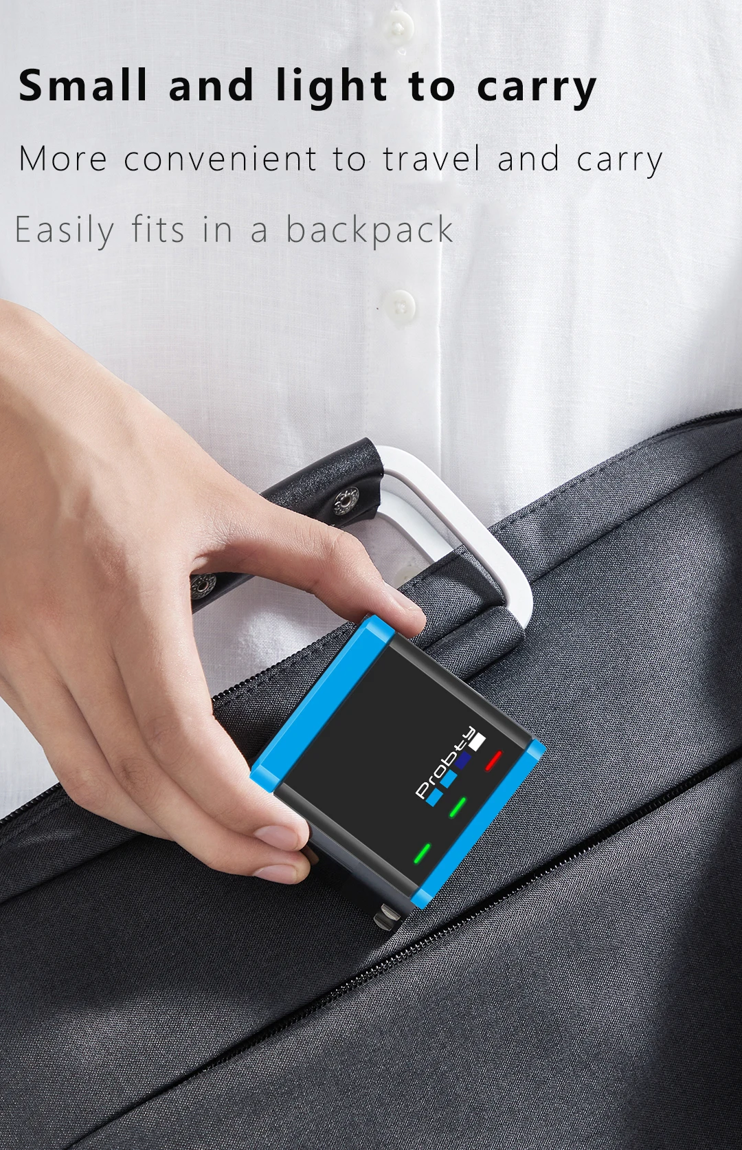 guardarse en su mochila/bolso de cámara/equipaje, de modo que el cargador se pueda colgar fácilmente en la correa de la mochila o