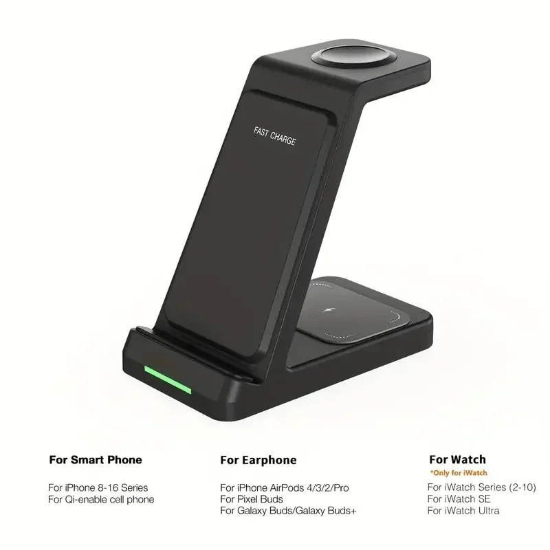 【Altamente compatible】: base de carga 3 en 1 perfecta para Apple, compatible con iPhone 17/17 Pro/17 Pro Max/16e/16 Plus/16Pro/16 Pro max15/15 Plus/15Pro/15 Pro max/14/14 Plus/14Pro/14 Pro/14 Pro max/13Pro/13Pro Max/13 mini/12Pro/12Pro/12Pro Max/12 mini/11/11Pro/11Pro Max/XS/XR/XS MAX/X/8/ 8Plus y Apple iWatch 10/9/8/7/6/5/4/3/SE/Ultra 1/2 y AirPods Pro2/Pro/4/3/2 (Nota: El estuche de carga