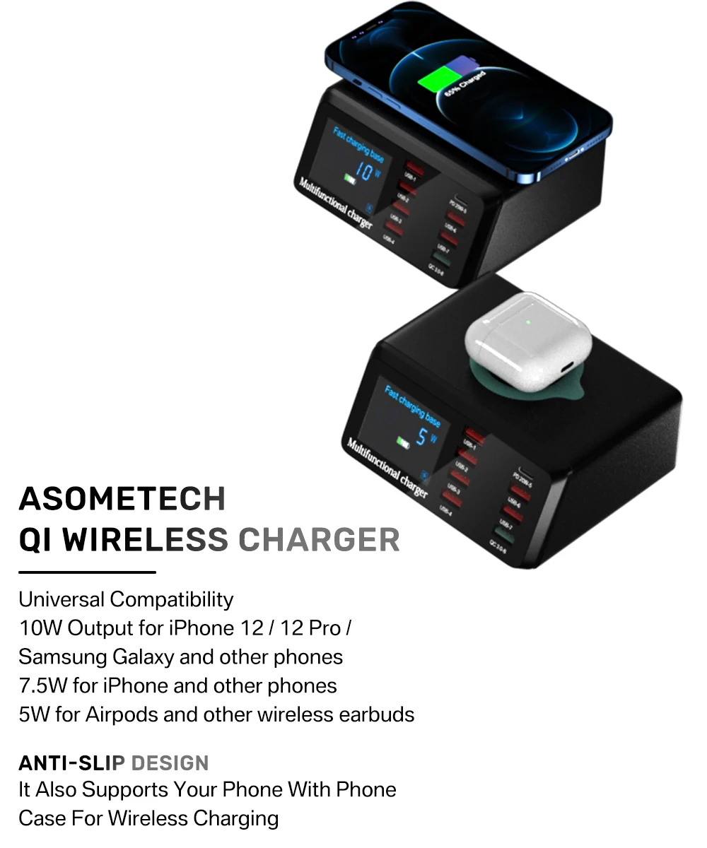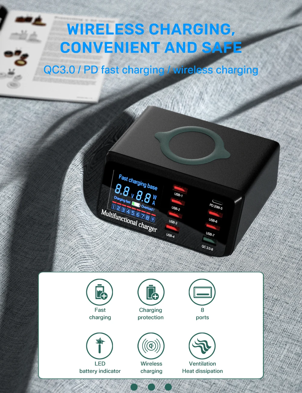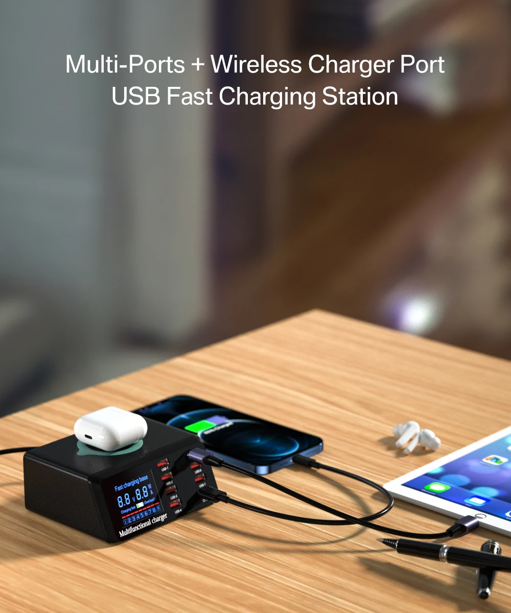 ✔ High Power Charging:The Total Power Of 100 Watts Supports Fast Charging Of 9 Devices At The Same Time, Which is Equipped With A Quick Charge 3.0 USB Fast Charging Port And A 20W USB Type C PD3.0 Fast Charging Port And A Supporting 2.5W/5W/7.5W/10W Smart Wireless Fast Charging .Compatible for iPhone 12,11,XS,9,8 Plus, iPad, iPod,Airpods,Samsung, Smartphones, Tablet,Bluetooth Earphone and Multiple Devices.