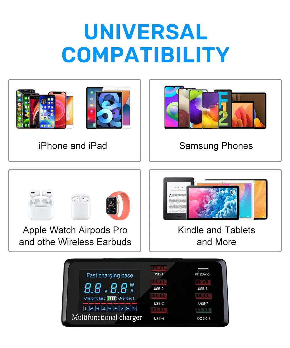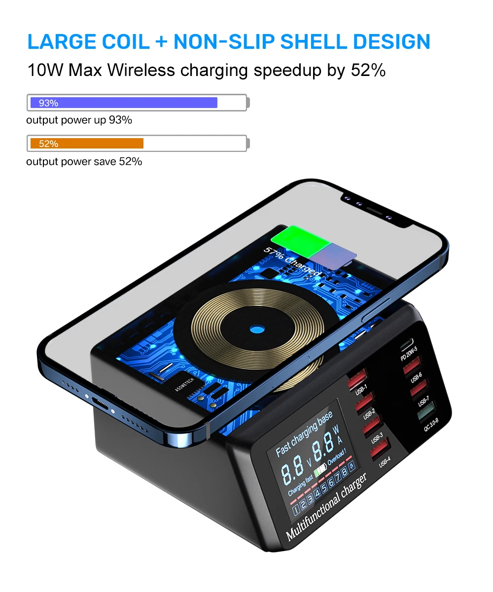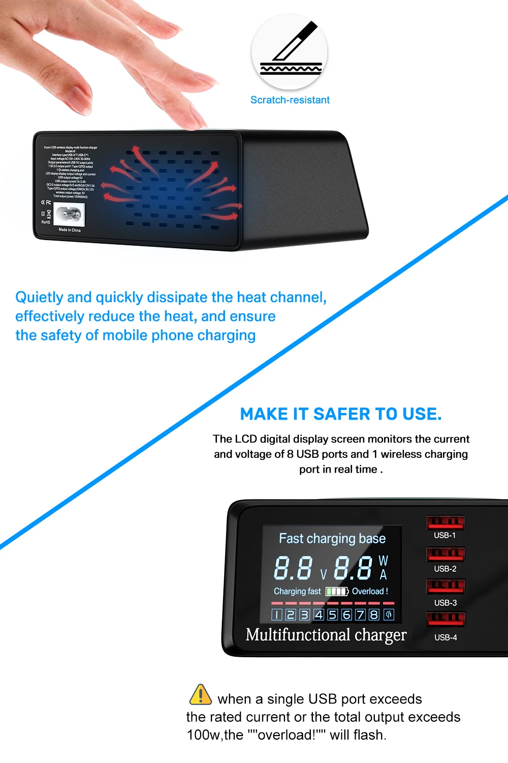✔ High Power Charging:The Total Power Of 100 Watts Supports Fast Charging Of 9 Devices At The Same Time, Which is Equipped With A Quick Charge 3.0 USB Fast Charging Port And A 20W USB Type C PD3.0 Fast Charging Port And A Supporting 2.5W/5W/7.5W/10W Smart Wireless Fast Charging .Compatible for iPhone 12,11,XS,9,8 Plus, iPad, iPod,Airpods,Samsung, Smartphones, Tablet,Bluetooth Earphone and Multiple Devices.