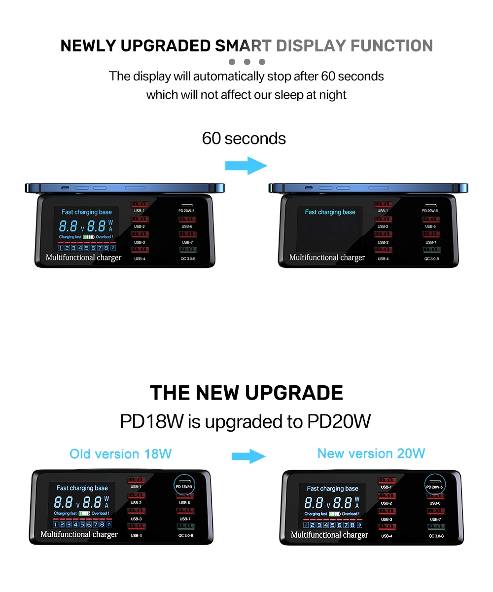 ✔ Smart LCD Display And Safety:The screen displays the current and voltage of each charging port (including wireless charging ports) in real time,Automatically Rest screen after 60 seconds,Built-in intelligent protection system, overvoltage, overheating, overcurrent, short circuit protection, stable and safe ABS+PC flame retardant material effectively prevents accidents , And passed FCC/RoHS/CE certification