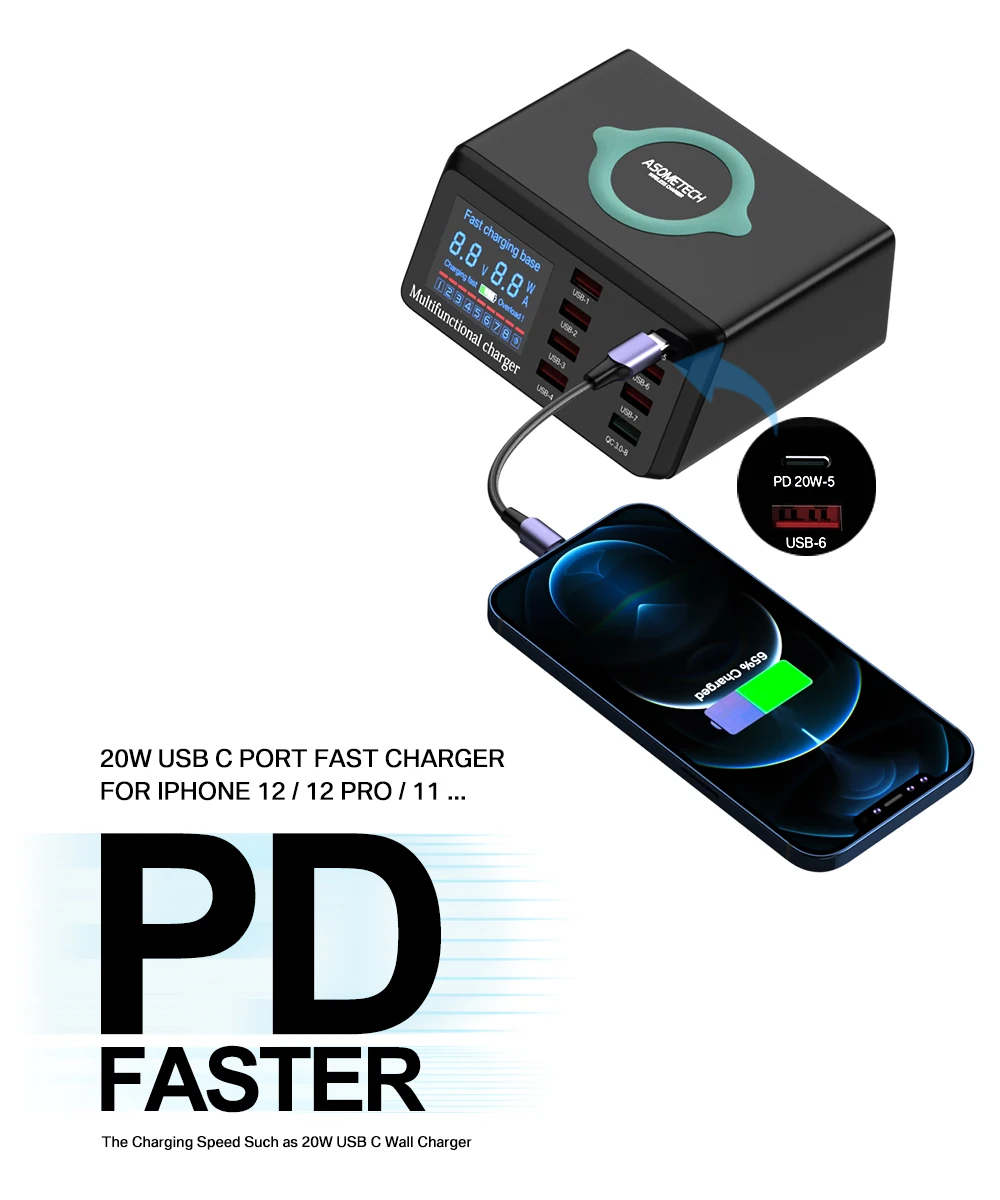 ✔ Unrivaled Speed:1 USB Type C (PD) Port Has PD2.0 PD3.0 Fast Charging Protocol,The Power is 20 Watts,And Provides The Maximum Charging Capacity For iPhone 12.It is 4 Times Faster Than With A Original 5W Charger.1 Quick Charge 3.0 Port Can Provide 5V3.4A / 9V2.3A / 12V1.5A Charging Speed.6 Regular USB Ports Can Provide up To 5V / 1A-2.4A charging speed.