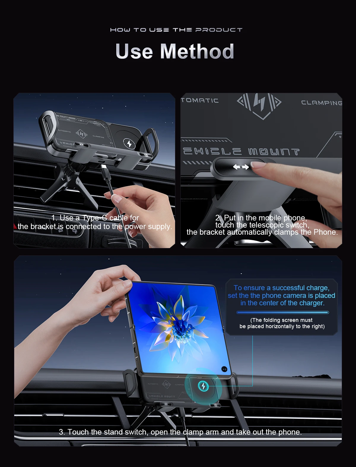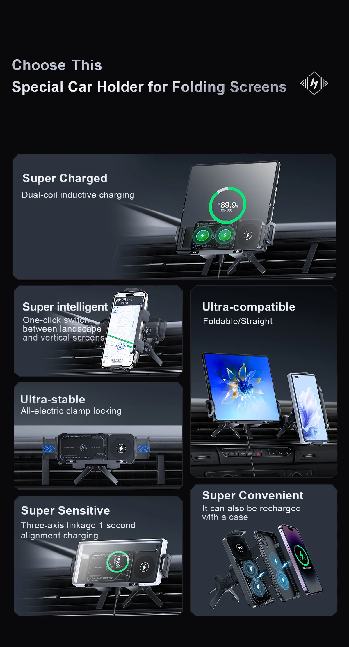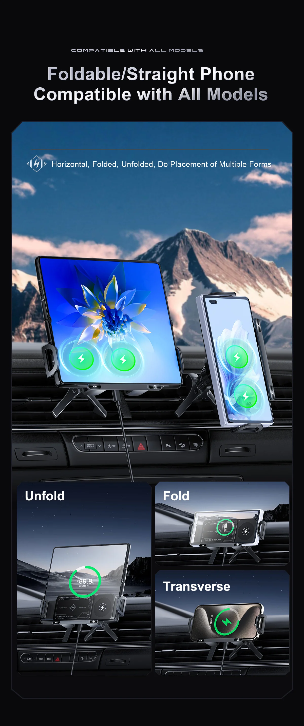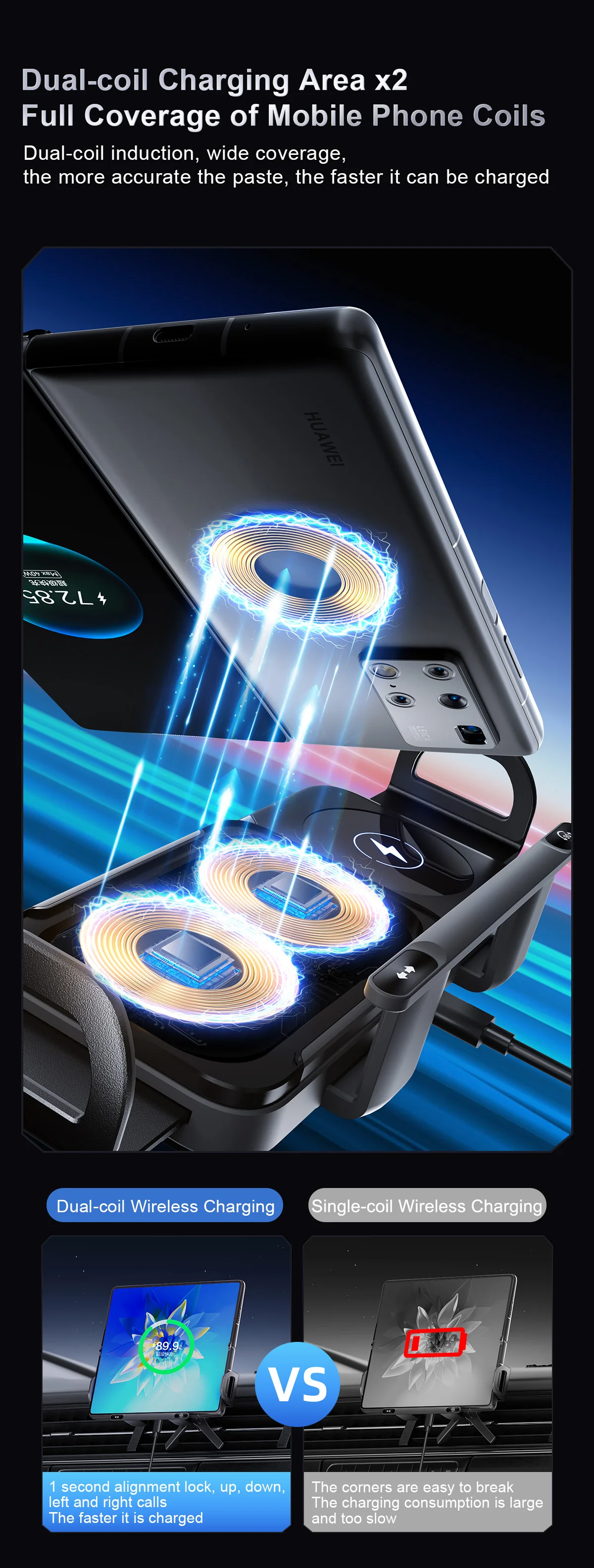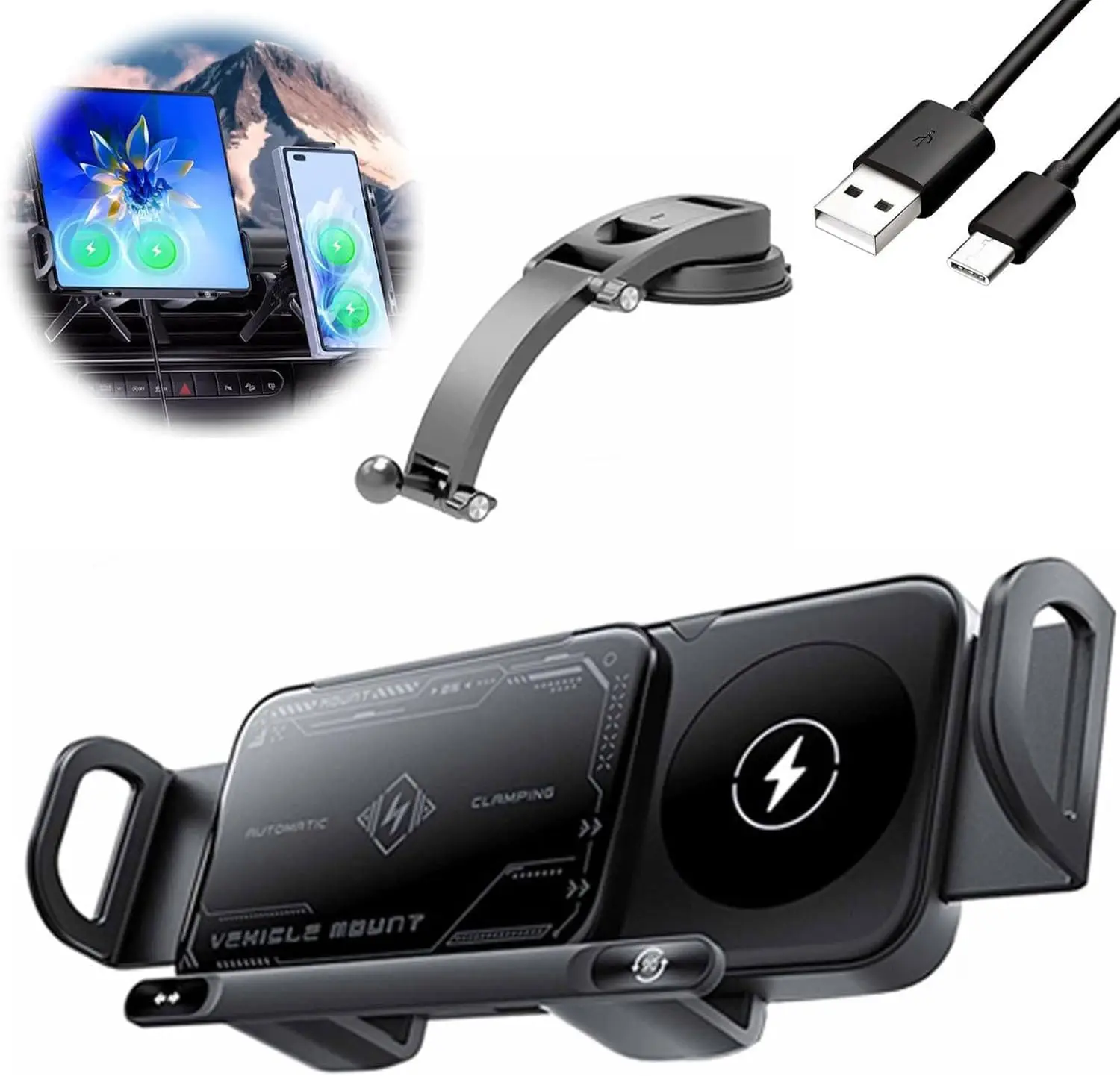 Comprar Cargador inalámbrico para coche 2 en 1, soporte para teléfono eléctrico plegable para carga rápida de 15W, adecuado para iPhone, Xiaomi, Samsung, iPad y tableta