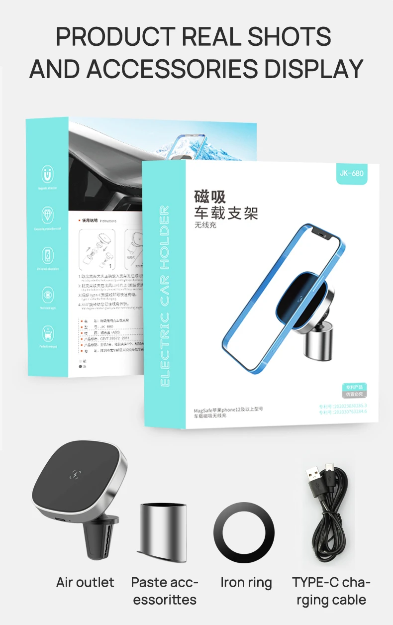 3. Funciona con todos los dispositivos de carga inalámbrica, como Samsung S20 10 Note 20 10 9, Huawei Mate 20, Xiaomi iPhone 11 pro Max, XS, XR, etc. solo necesita agregar un Anillo de hierro para lograr la función de carga inalámbrica magnética.