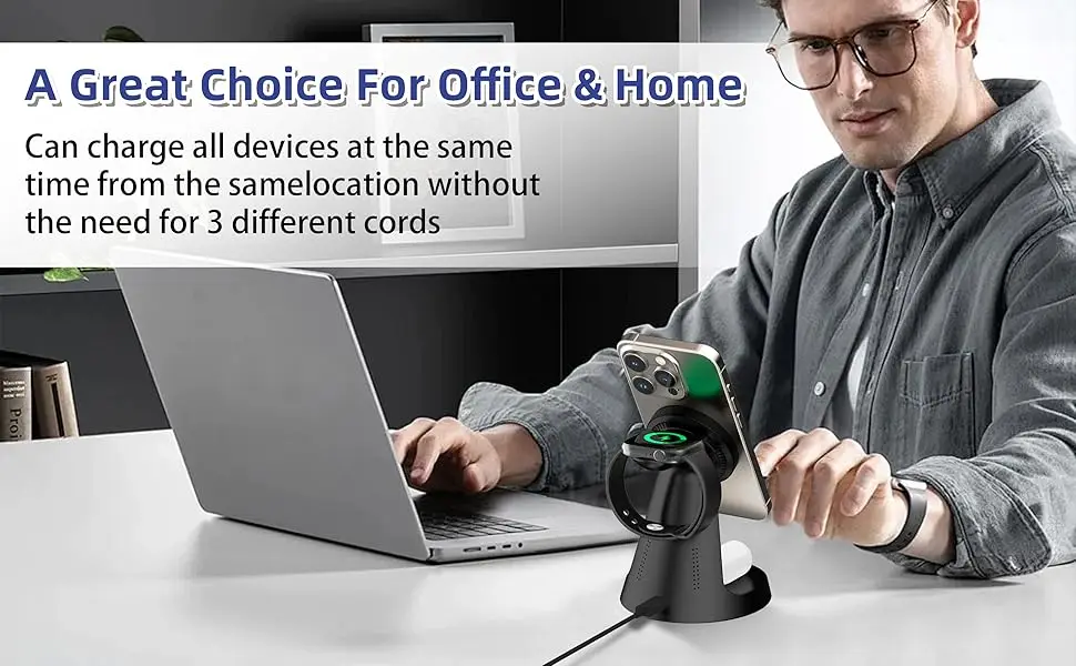 Una estación, los cobra todos- La estación de carga para múltiples dispositivos ofrece una potente velocidad de cierre y carga de 15 W que rivaliza con la carga por cable.Esta estación de acoplamiento inalámbrica es totalmente compatible con iPhone 12-17, Apple Watch (Serie 2 a Ultra 2) y AirPods (Pro/2/3/4 con estuche de carga inalámbrico).Simplifique su vida con una base de estación de carga ordenada, eficiente y unificada.