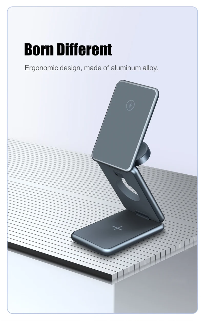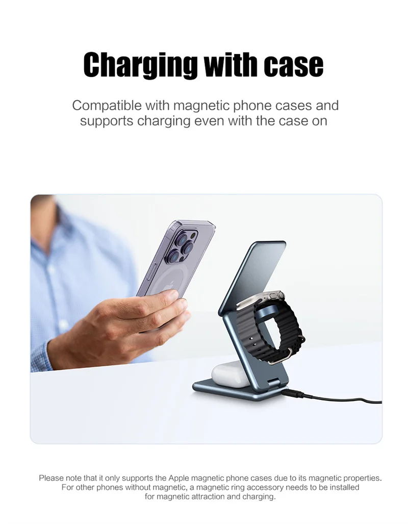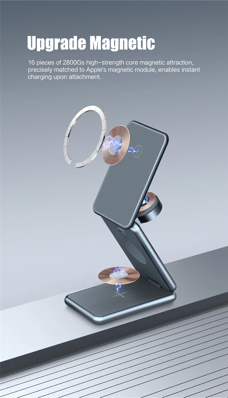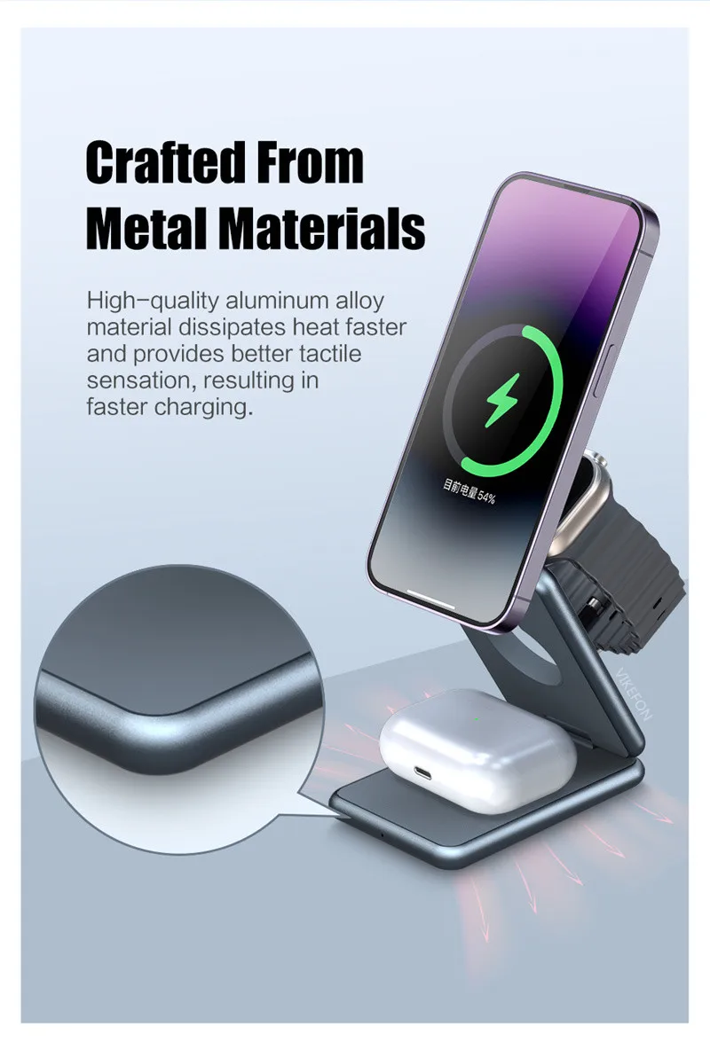 [Diseño único para los fans de Apple]La estación de carga inalámbrica VIKEFON 3 en 1 combina las ventajas de todos los demás dispositivos de carga inalámbrica, desde Flat-Lay hasta Dock, y se ha convertido en un excelente trabajo para satisfacer todas sus necesidades: 1. carga inalámbrica 3 en 1 al mismo tiempo; 2. La mitad del tamaño de su teléfono después de plegable; 3. Función magnética N52; 4. Toda la aleación de aluminio, textura de gama alta.