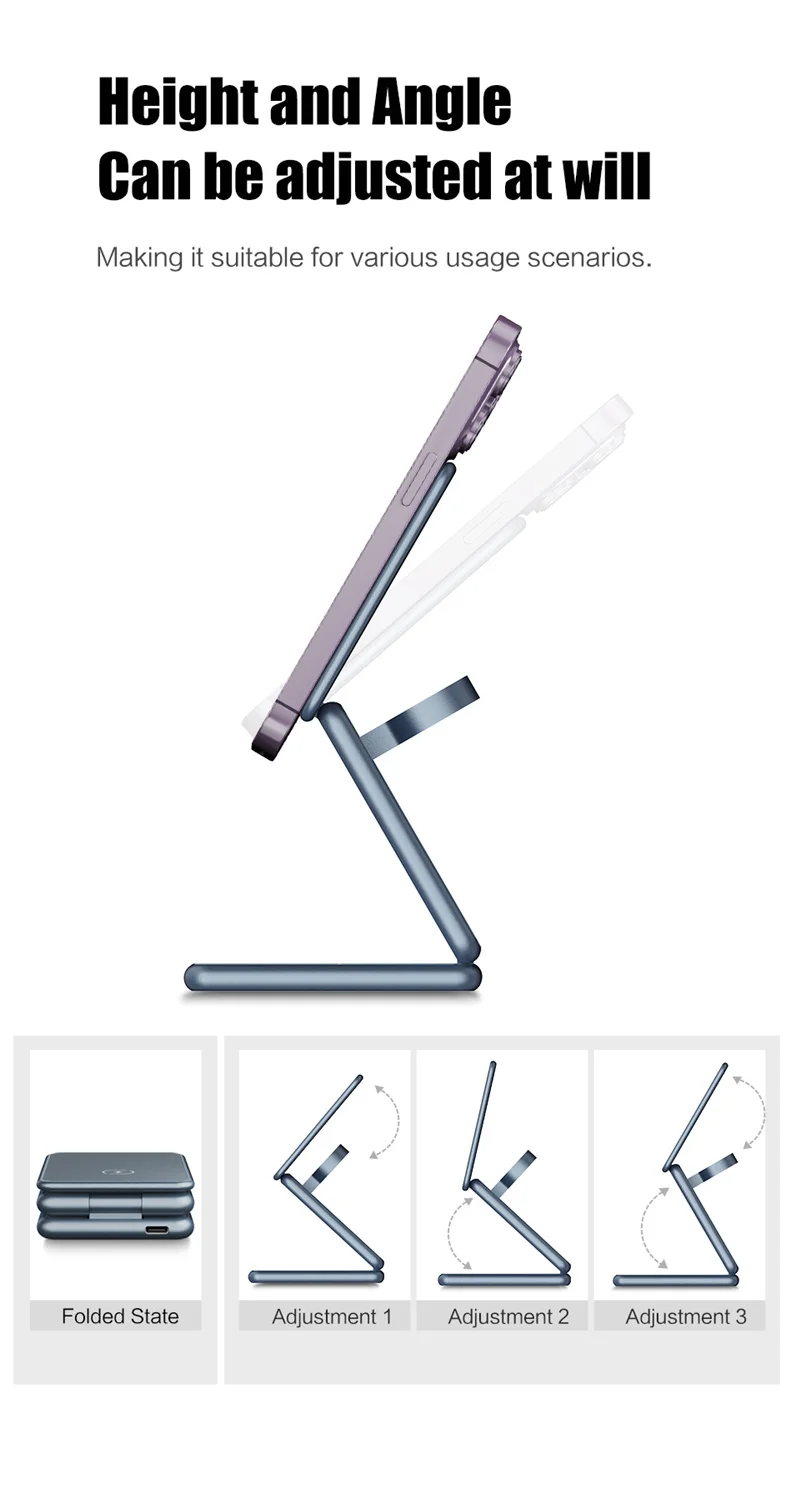 [Tamaño de La Palma Cargador plegable]El diseño innovador de tres hachas del rollo hace el cargador funcional en estilos de carga. Dóblelo para carga horizontal. Desplegarlo para que sea un soporte para carga vertical. Después de ser plegada, esta estación de carga tiene solo la mitad del tamaño del iPhone y menos de una pulgada de grosor. Sólo 0.43lb, lo suficientemente pequeño, lo suficientemente portátil. Puedes llevarlo a cualquier lugar sin ocupar espacio. Un gran paso en la portabilidad y el ajuste del ángulo abre un nuevo mundo de carga inalámbrica.