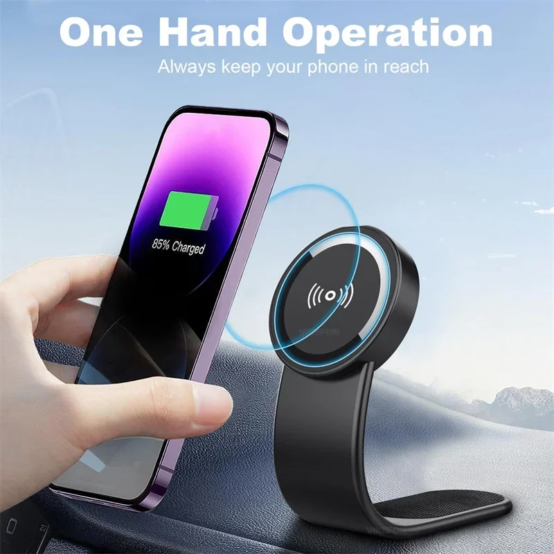 Magnético fuerte: El potente magnético fija el teléfono sin deslizarse, lo que permite que su teléfono esté completamente concentrado en la placa de carga para acelerar la carga. NUEVO Diseño Bendable 15W Car Mobile Phone Holder Cargador inalámbrico Phone Holder para iPhone 12-15 Dashborad Center Console.
