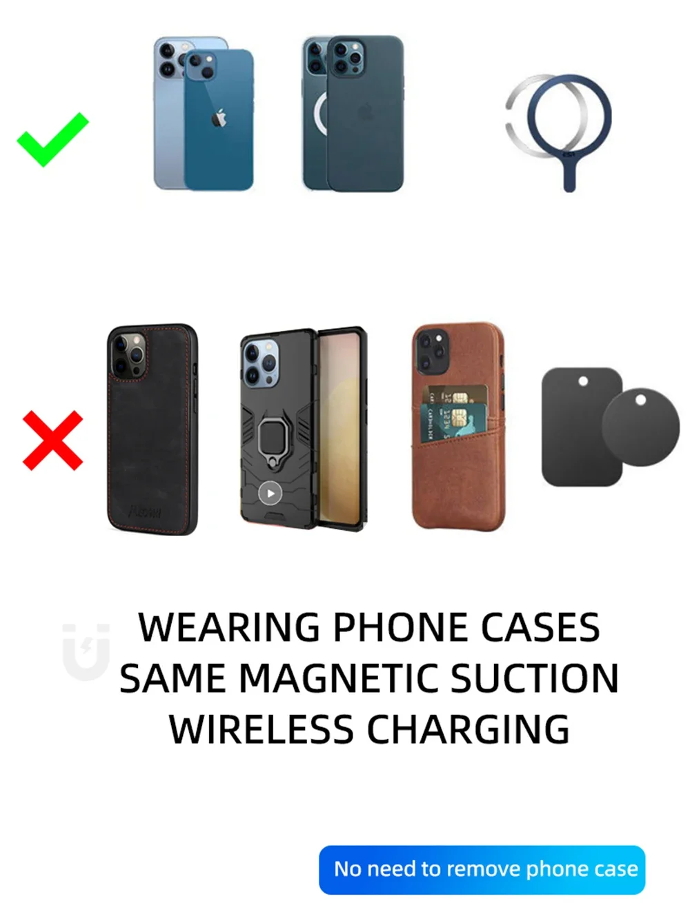 3. La serie iPhone 11 X Xs Xr 8 y otros teléfonos Android NO son compatibles con la función magnética. Deben usarse con la funda megnet o conectar el anillo magnético a la parte posterior del teléfono para una función magnética.