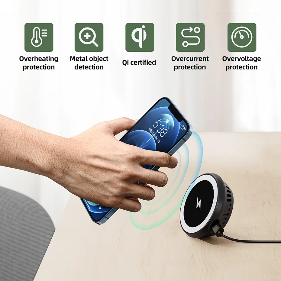 5. Carga segura. El cargador inalámbrico magnético aceplast cumple con el estándar de carga inalámbrica Qi, con detección de metales, protección contra sobretensión, protección contra sobrecorriente, Y funciones de protección contra sobrecalentamiento para proteger completamente la seguridad del teléfono móvil durante la carga inalámbrica.