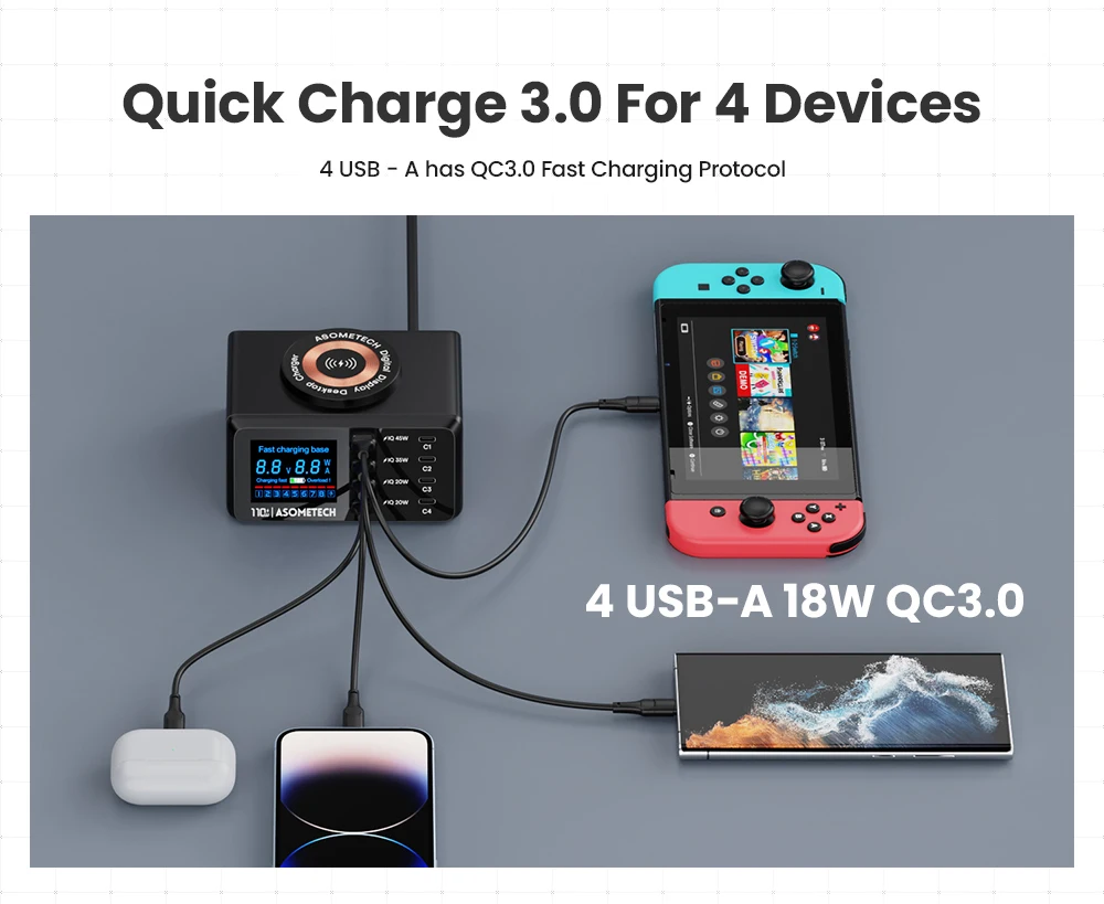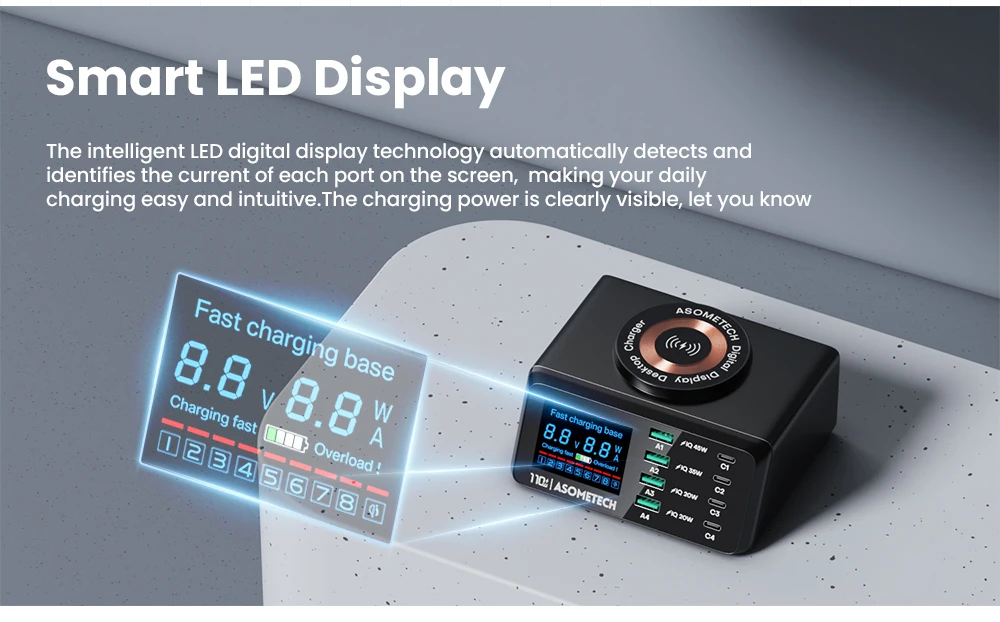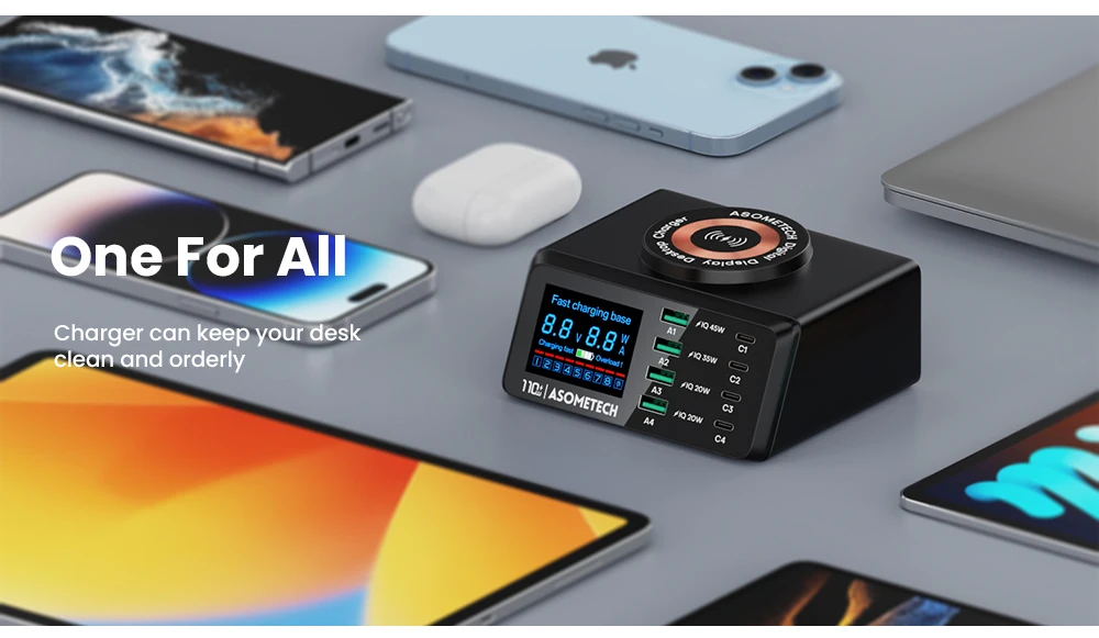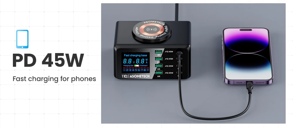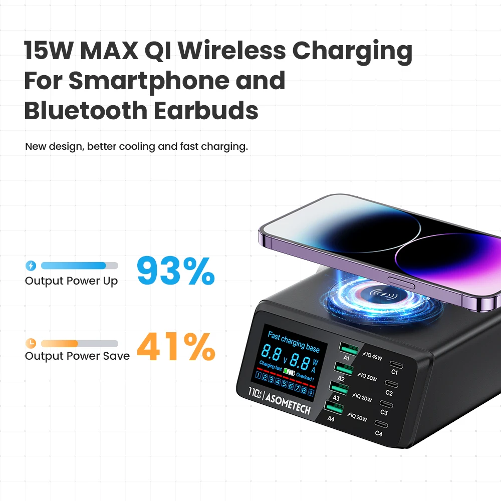 110W 4 USB tipo C PD carga rápida + 4 USB A QC3.0 carga rápida + carga inalámbrica QI