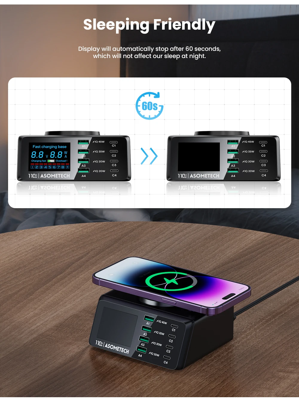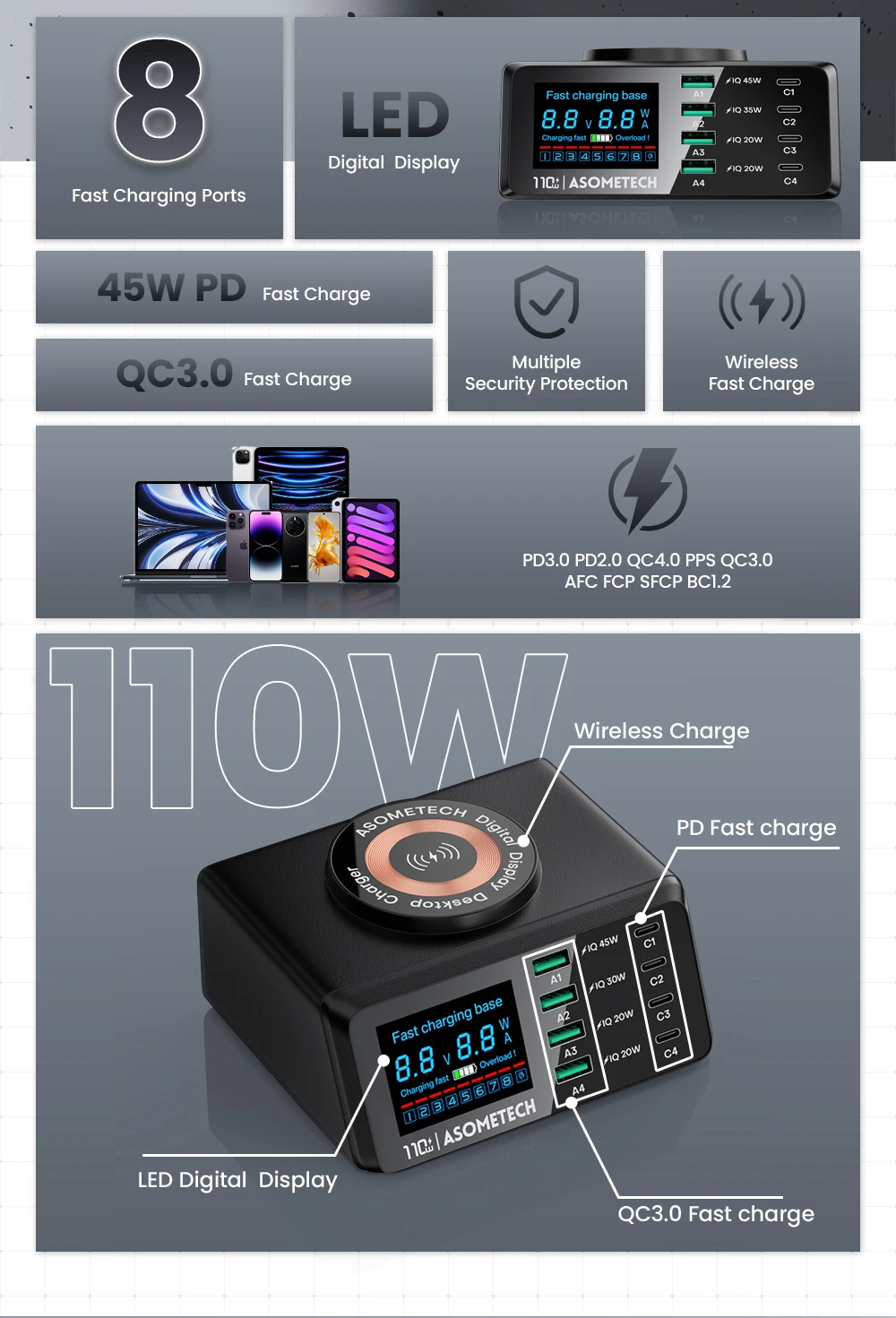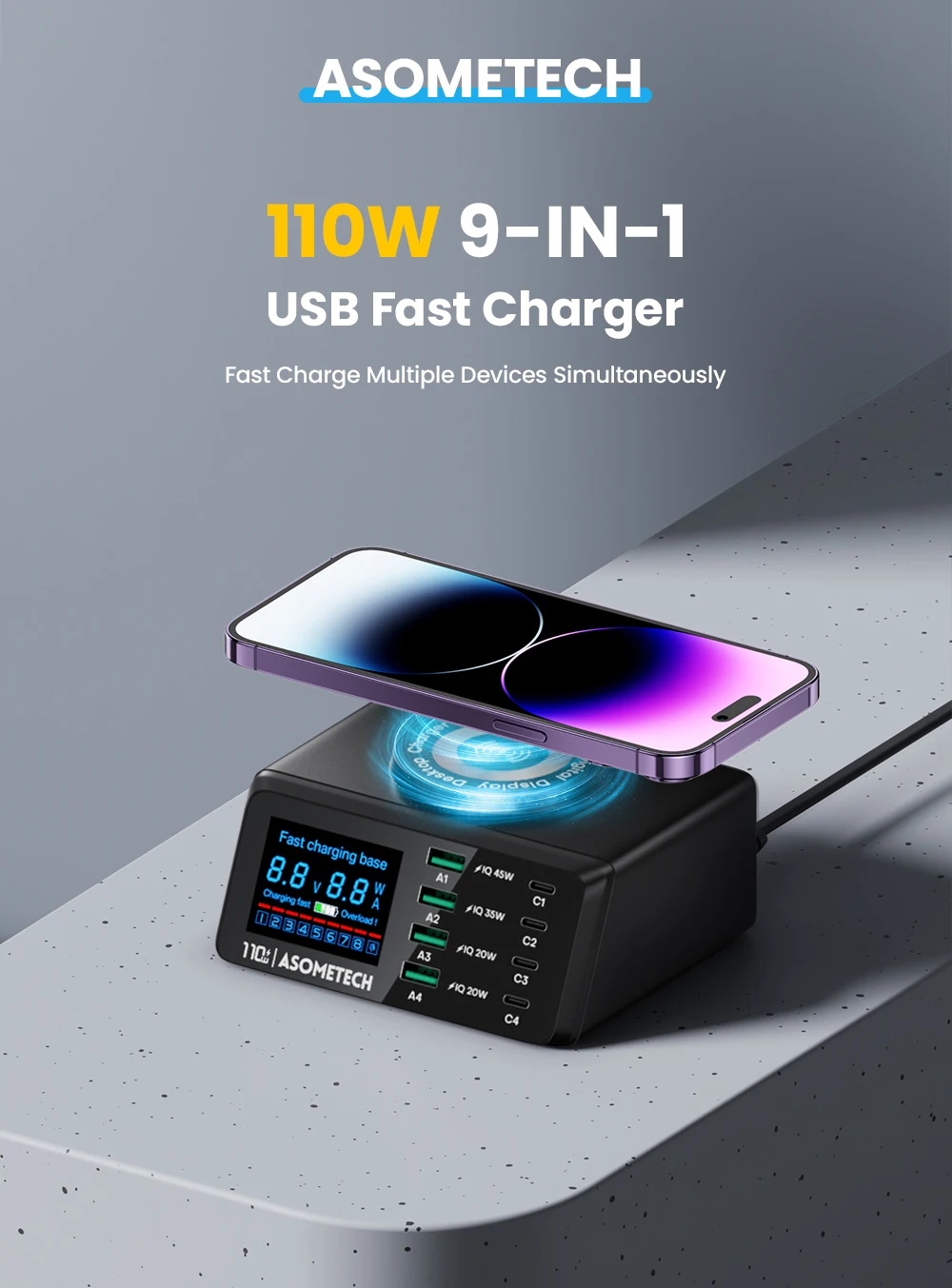 110W 4 USB tipo C PD carga rápida + 4 USB A QC3.0 carga rápida + carga inalámbrica QI