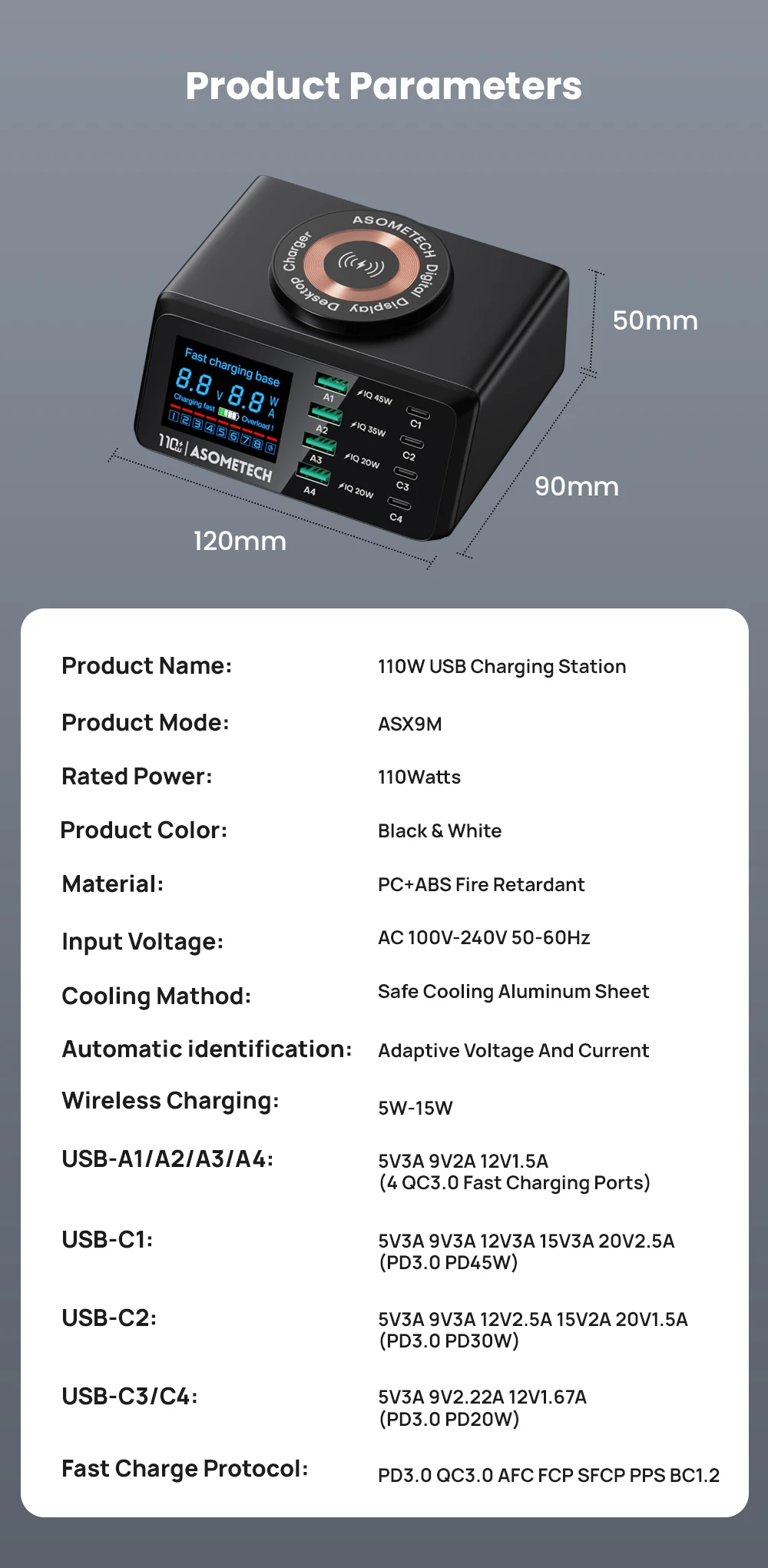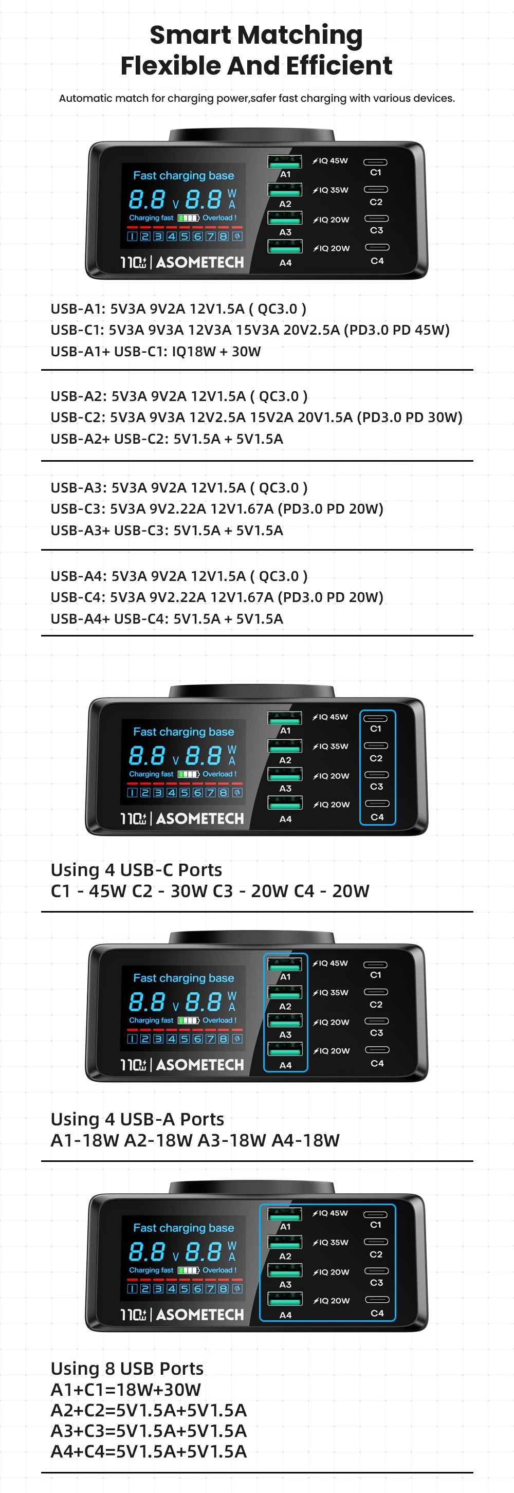 USB-A3: 5V3A 9V2A 12V1.5A (QC3.0)