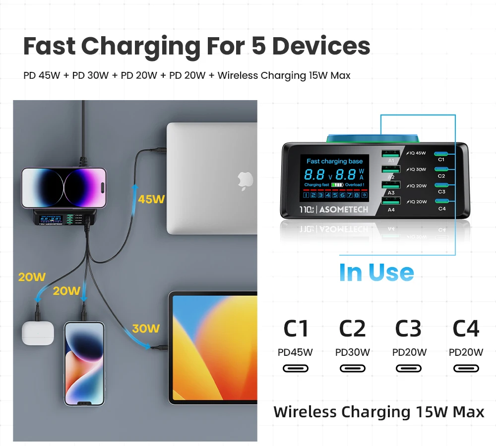 PD 45W + PD 30W + PD 20W + PD 20W + Carga inalámbrica 15W máx.