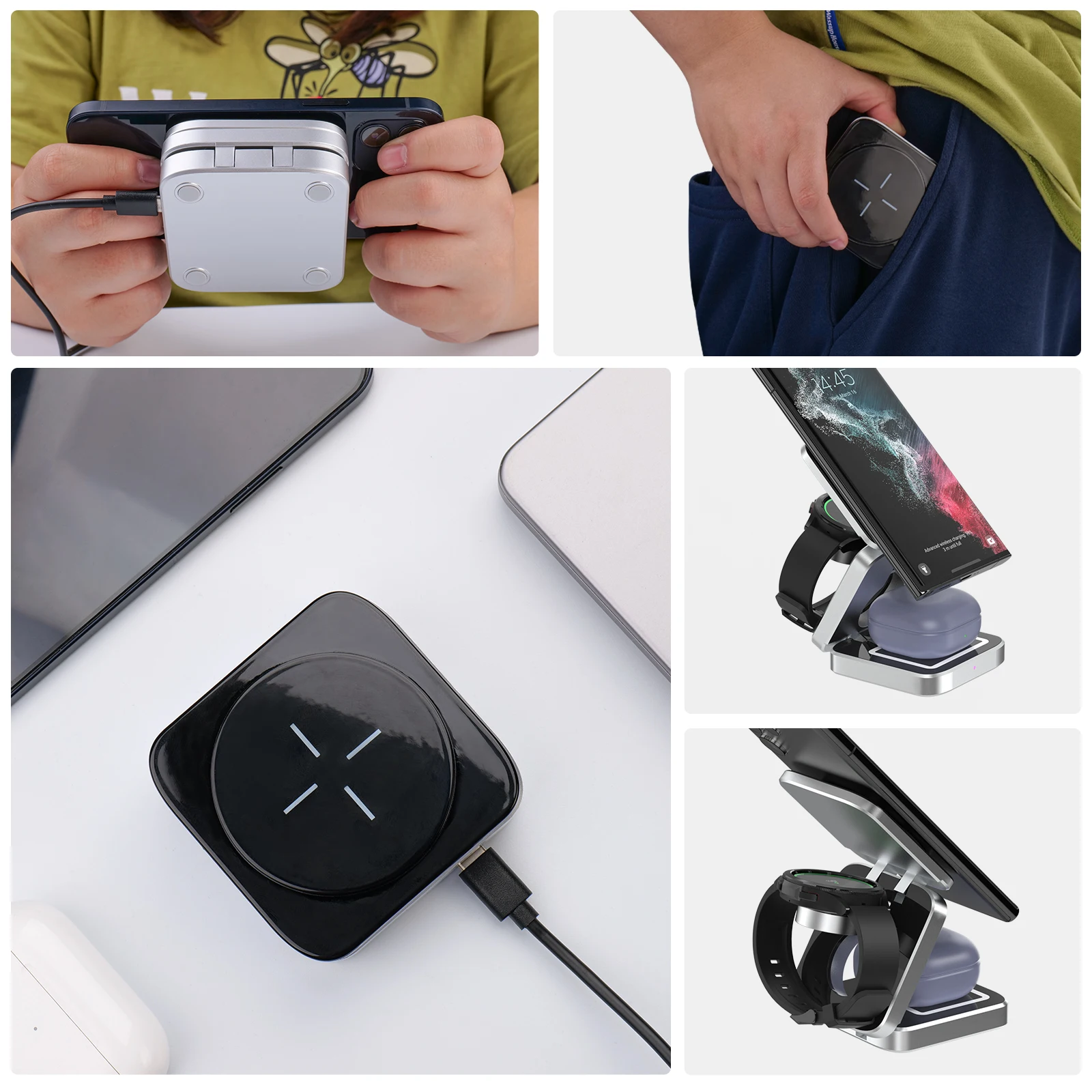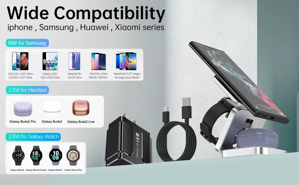 Cargador inalámbrico 3 en 1 compatible con Samsung Phone, Galaxy Watch,Buds. Para teléfonos Samsung: Galaxy S Series, Galaxy Z Series, Galaxy Note Series (S23, S23 + ,S23 Ultra, S22, S22 + ,S22 Ultra,S21,S21 +,S21 fe, s21 Ultra,S20,S20 +,S20 Ultra,S20; FE,S10/S9/S8/S7/S6; Note20,10,10e,10 +,9,8,7,5; Flip, flip 3, Z Flip 4/3/2/1; Z Fold 4/3/2/1); para el reloj Samsung: Galaxy Watch 5 Pro/5/4 Classic/Galaxy Watch 4/3/Active 2; para auriculares: AirPods 3/2/Pro, Buds/Buds +/Pro/Live/