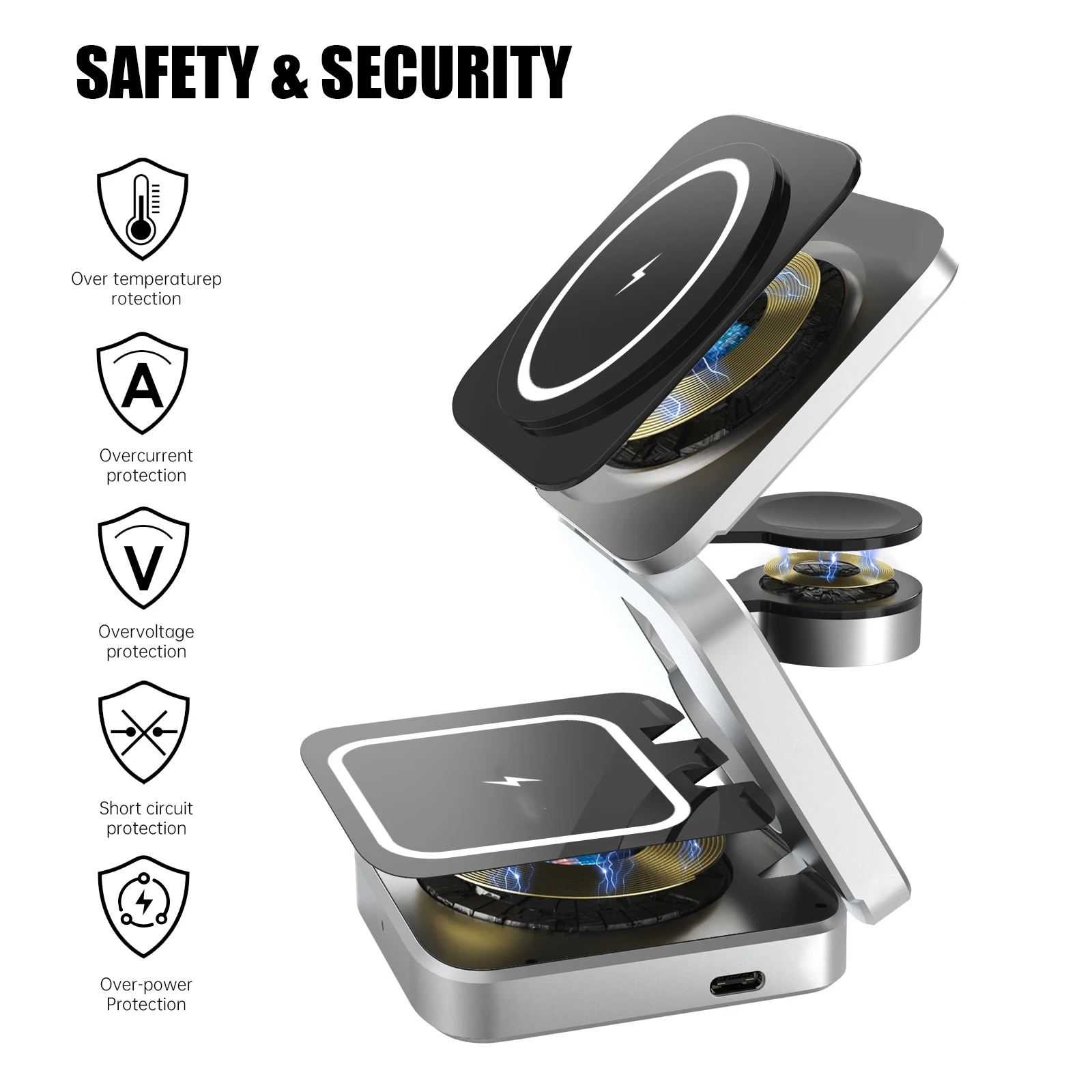 La base de carga inalámbrica para Samsung se somete a cientos de pruebas para proporcionar una carga estable y segura para su teléfono y reloj. Con protección avanzada contra sobrecorriente, protección contra sobretensión y tecnología de protección contra sobrecarga, Esta almohadilla de cargador rápido garantiza la seguridad de su carga