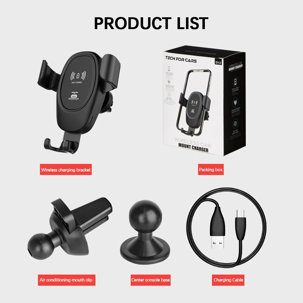 LISTA DEL PRODUCTO: Soporte de teléfono de carga inalámbrica + clip de boca de aire acondicionado + base de la consola central + cable de carga + manual