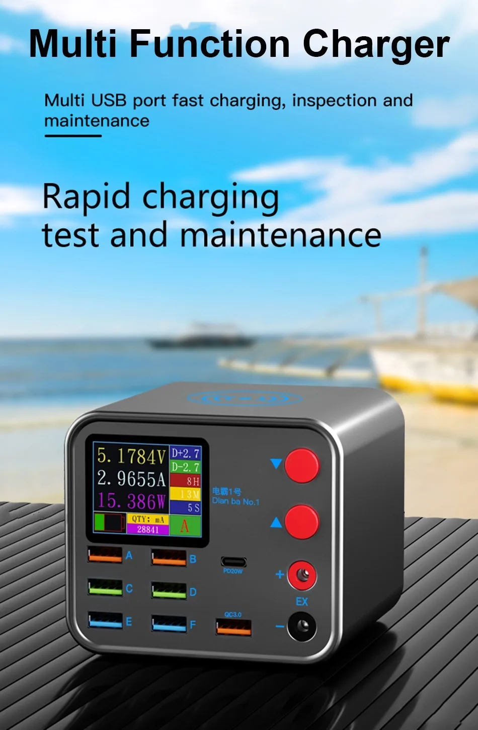 Carga rápida, grande pantalla a color, voltaje de inicio del teléfono móvil y detección de corriente, reparación de cortocircuito, protección contra sobretensión de cortocircuito, salida multipuerto, detección de línea de datos, carga rápida inalámbrica de 10W, protección de seguridad múltiple.