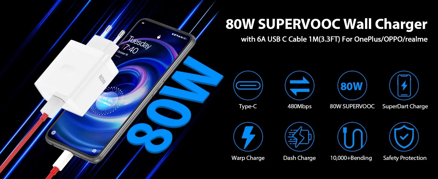 Para OnePlus 80W SuperVOOC cargador de pared rápido para OnePlus 8 9 9RT 10 Pro 11 12 12R Nord 2T CE 2 3 Lite ACE 2 OPPO Finx X3 X5 Pro Reno 7 8 10 Pro 30 9 10 11 12 GT NEO 2 3 3T Tipo-C a Cable de carga USB 1M 1,5 m 2M Enchufe DE LA UE Adaptador de corriente USB de viaje