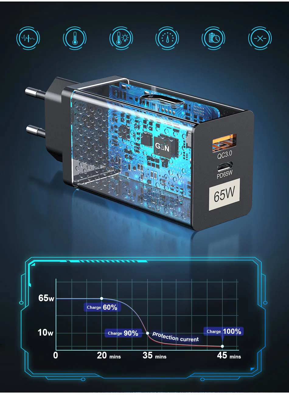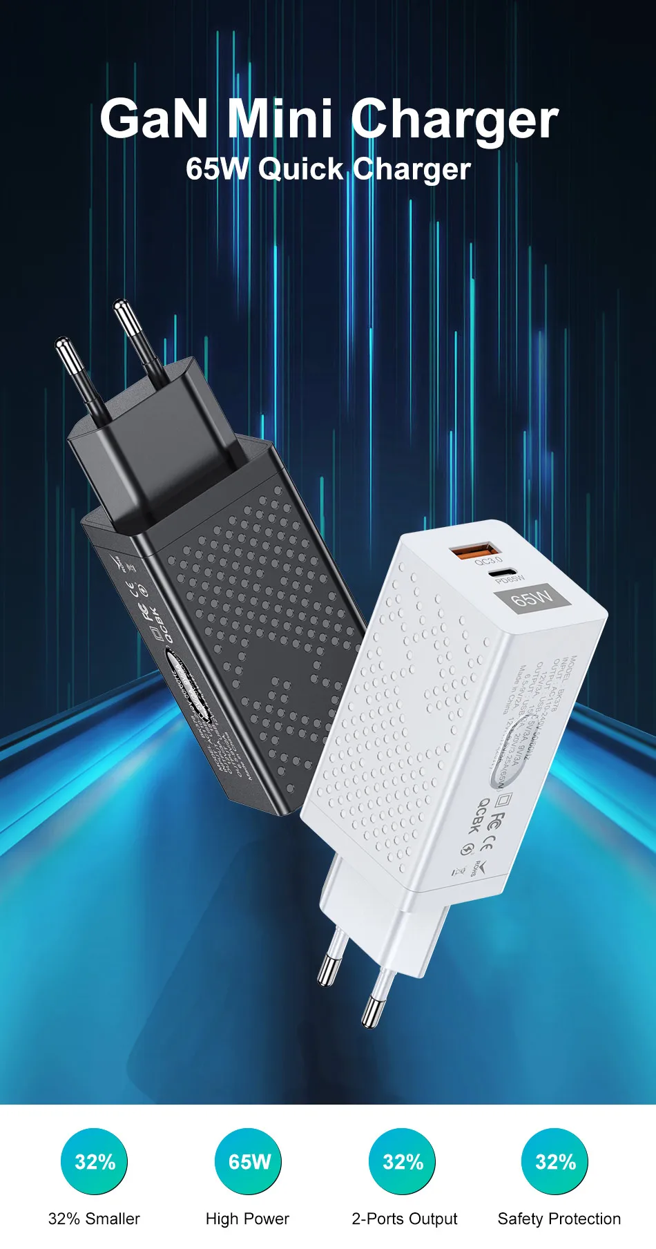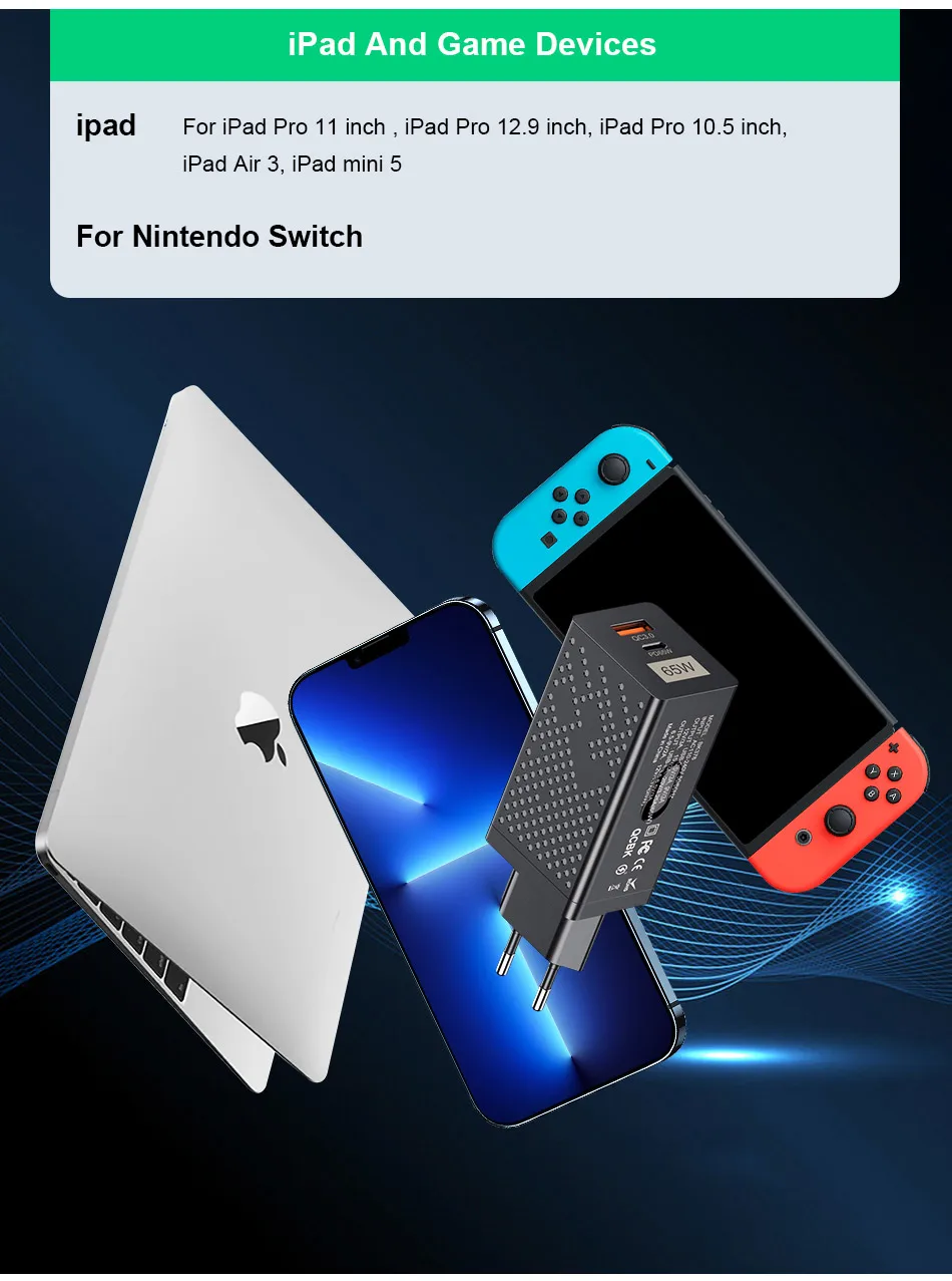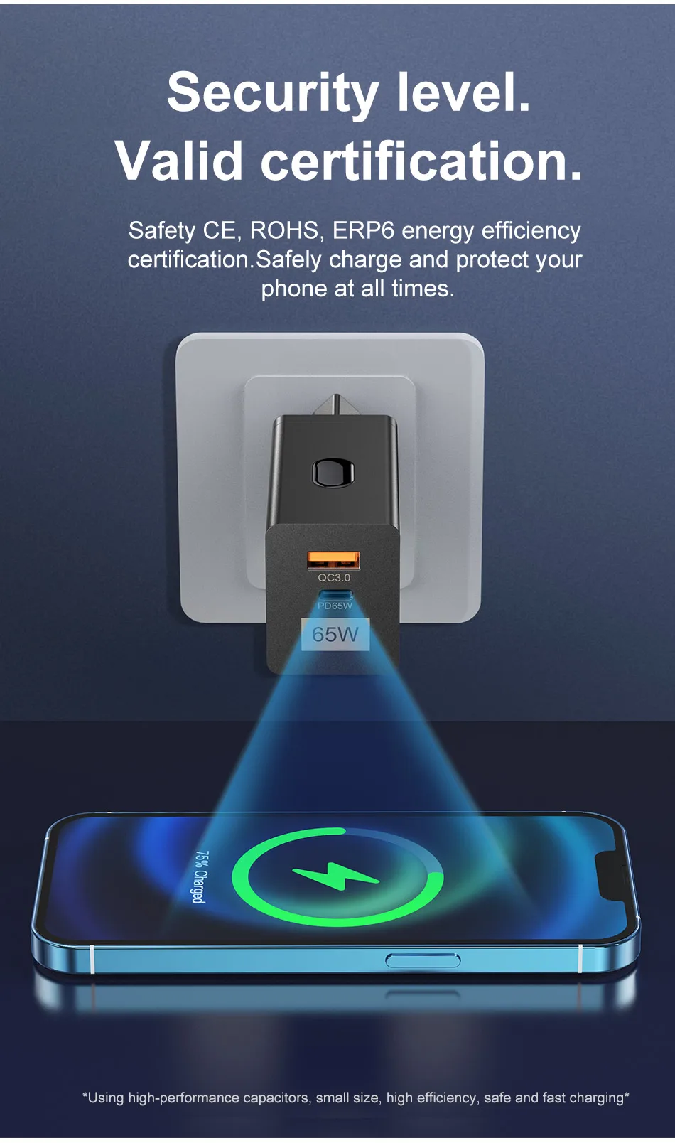 Comprar Cargador PD de 65W GaN para Macbook, iPad, portátil, tableta, adaptador de carga rápida QC3.0 para iPhone 14, 13 Pro, Max, 12 Xiaomi, Samsung S22, Poco