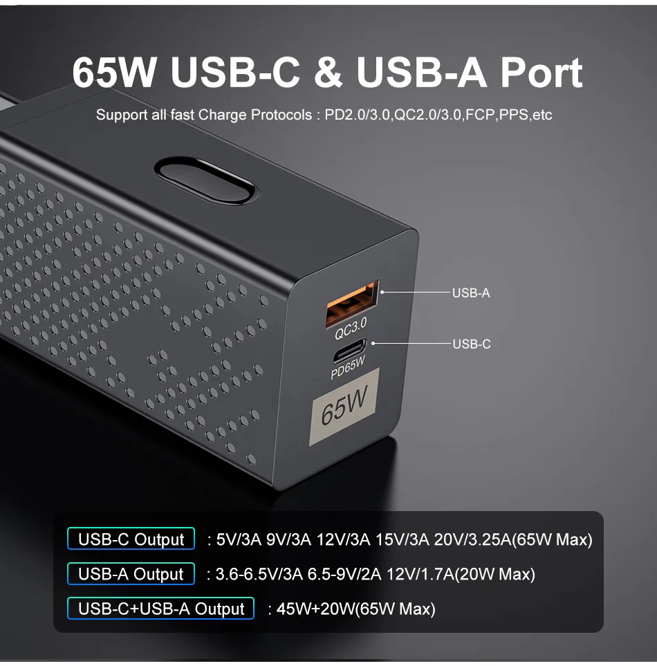Salida: USB-A + USB-C 45W + 20W (65W Max)