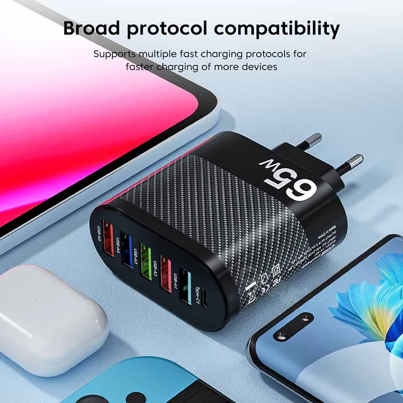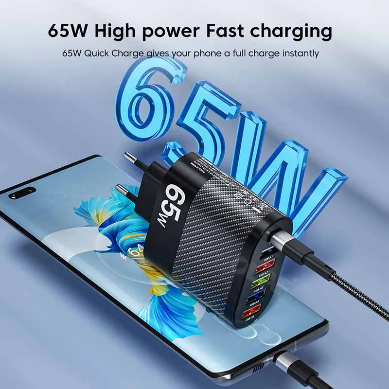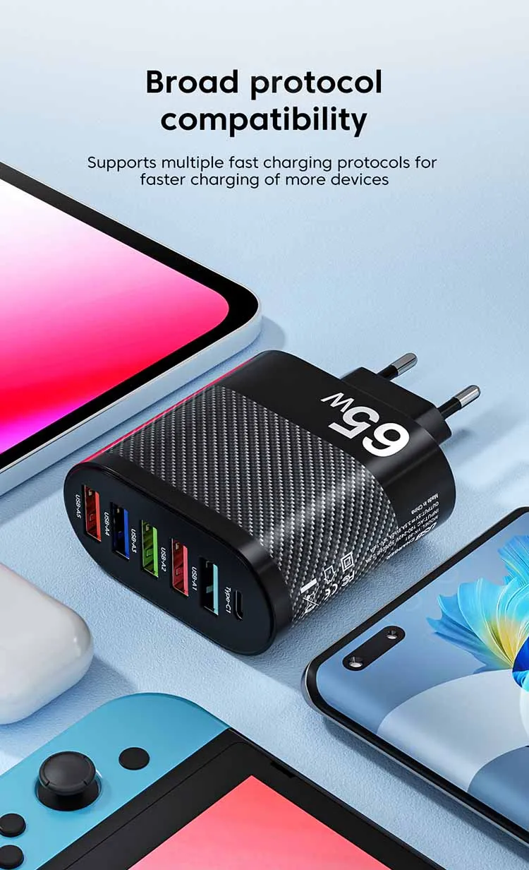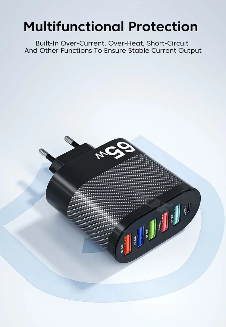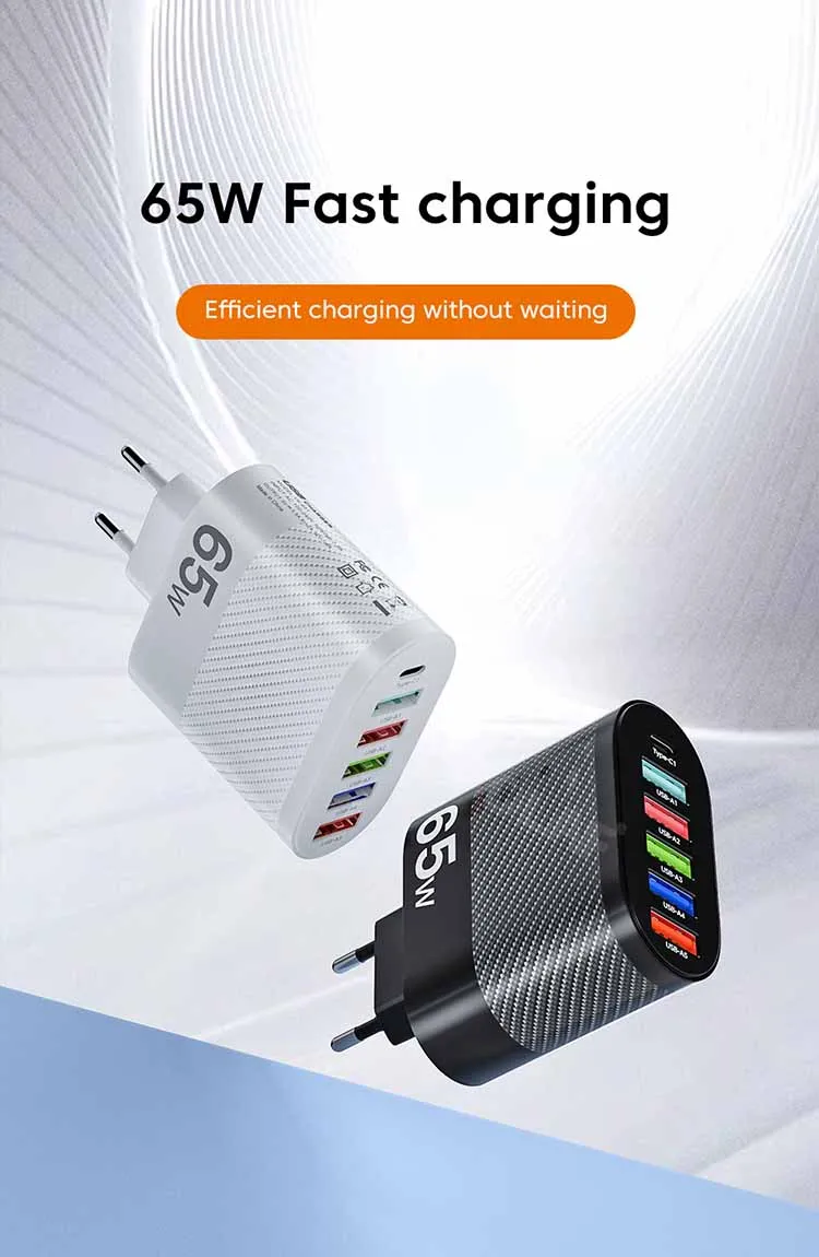Comprar Cargador rápido de 65W, 6 puertos, enchufe de la UE, EE. UU., Reino Unido, PD, USB, QC 3,0, tipo C, para iPhone, Xiaomi, Samsung