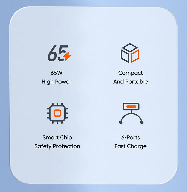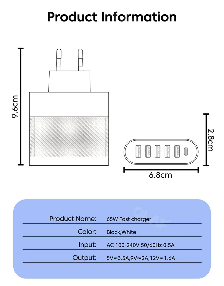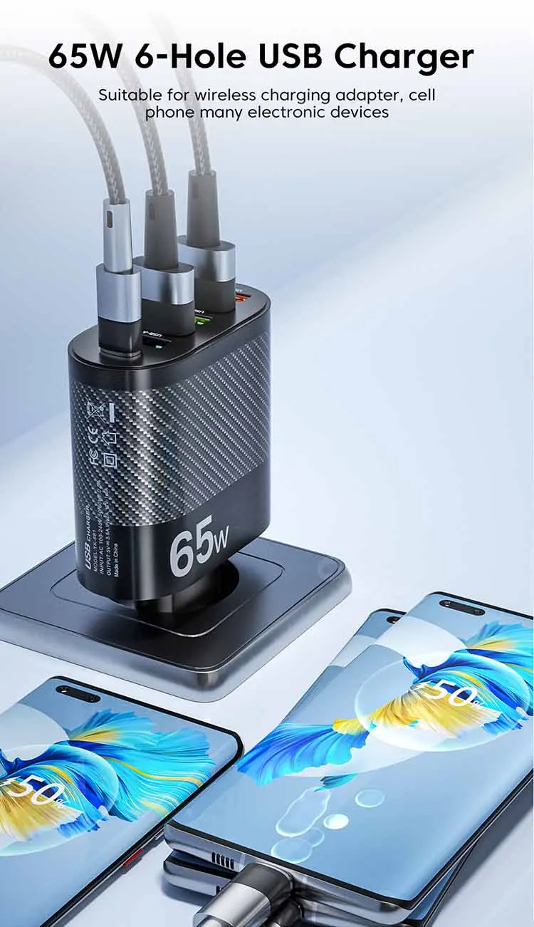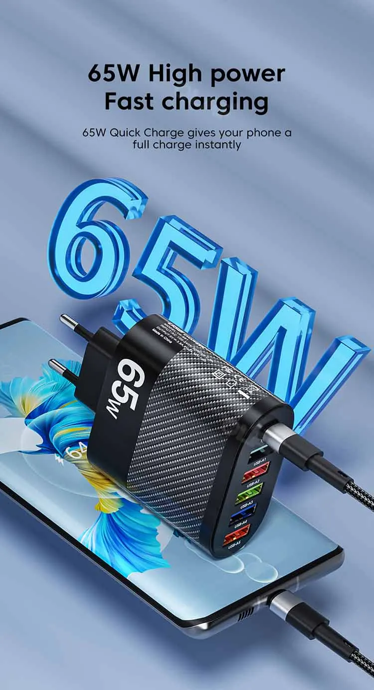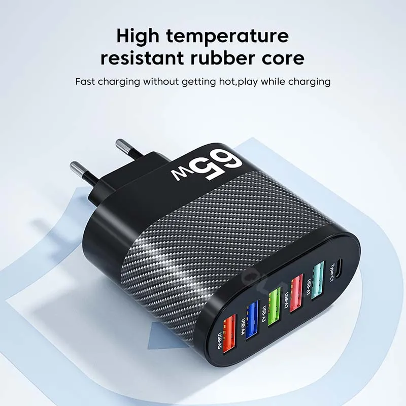 Comprar Cargador rápido de 65W, 6 puertos, enchufe de la UE, EE. UU., Reino Unido, PD, USB, QC 3,0, tipo C, para iPhone, Xiaomi, Samsung