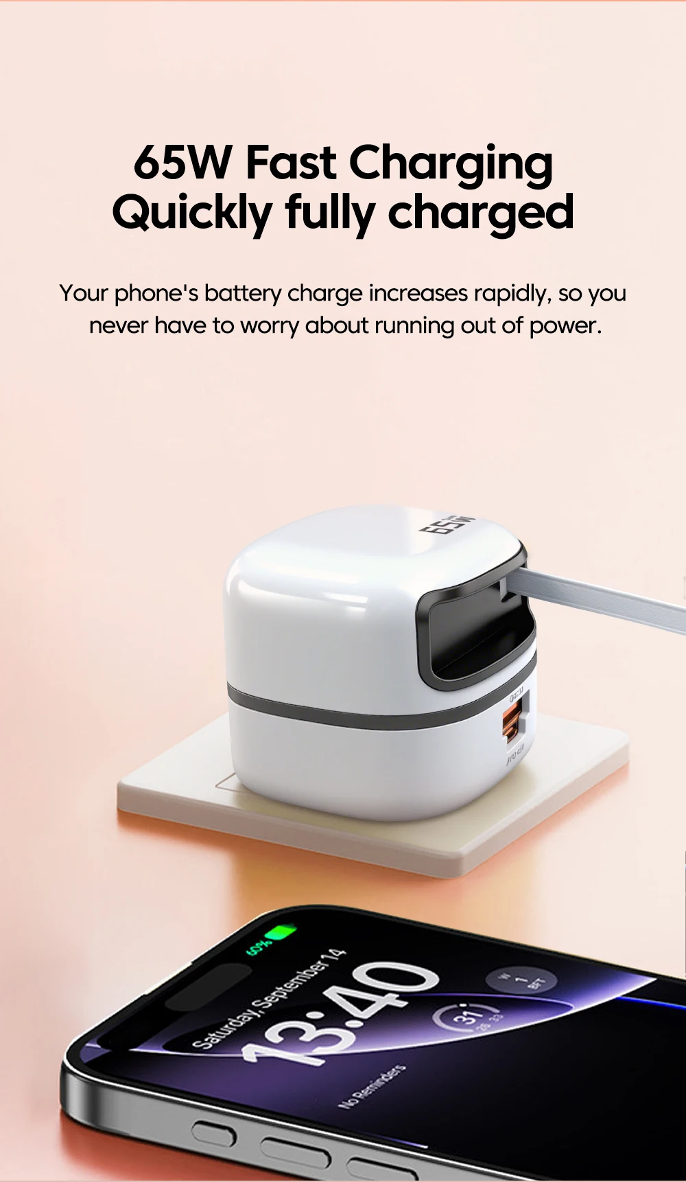 Comprar Cargador rápido de 65W, cargador de teléfono USB tipo C con Cable retráctil tipo C, carga rápida para iPhone 16, Samsung, Xiaomi, Huawei