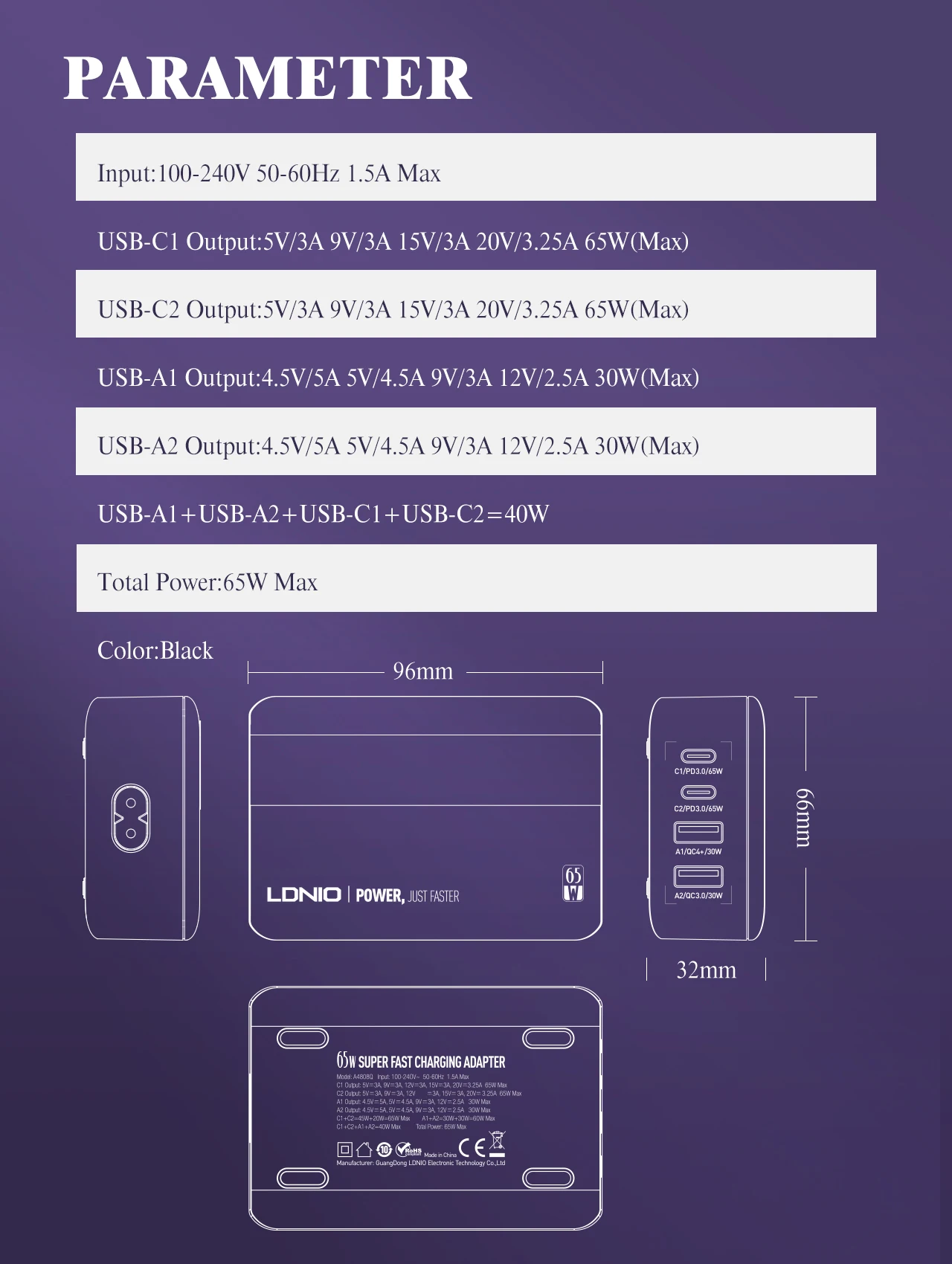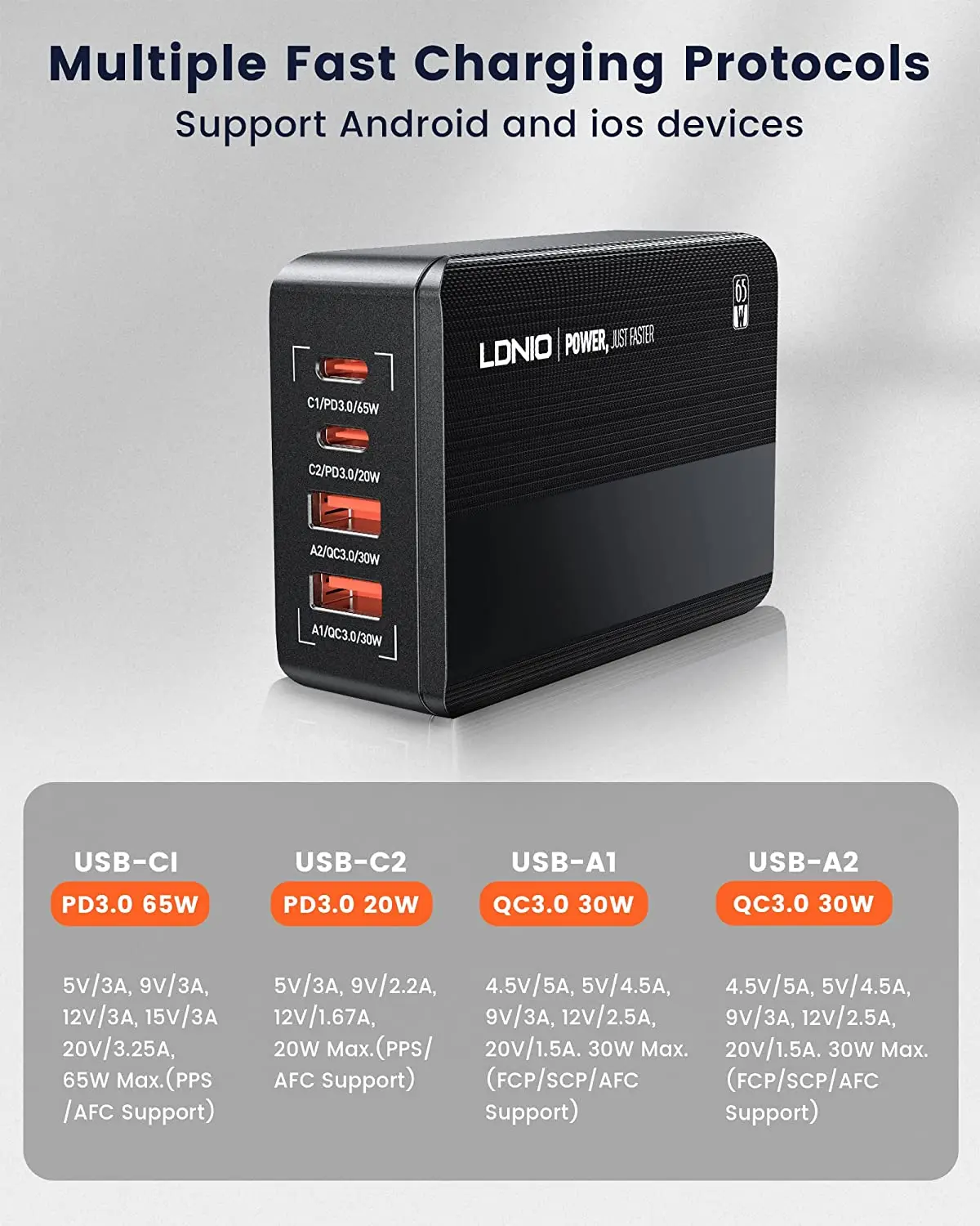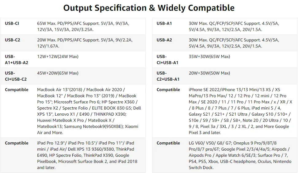 USB - C1=APPLE 5V/2. 4A; SAMSUNG 5V/2A; BC1. 2; MTK; PPS3. 3-21V/3A DCP5V/1. 5A; QC2. 0; QC3. 0; PD3.0; PD2. 0; QC4 + ; AFC 9V12V; FCP; SCP; PE1. 1; PE2.0