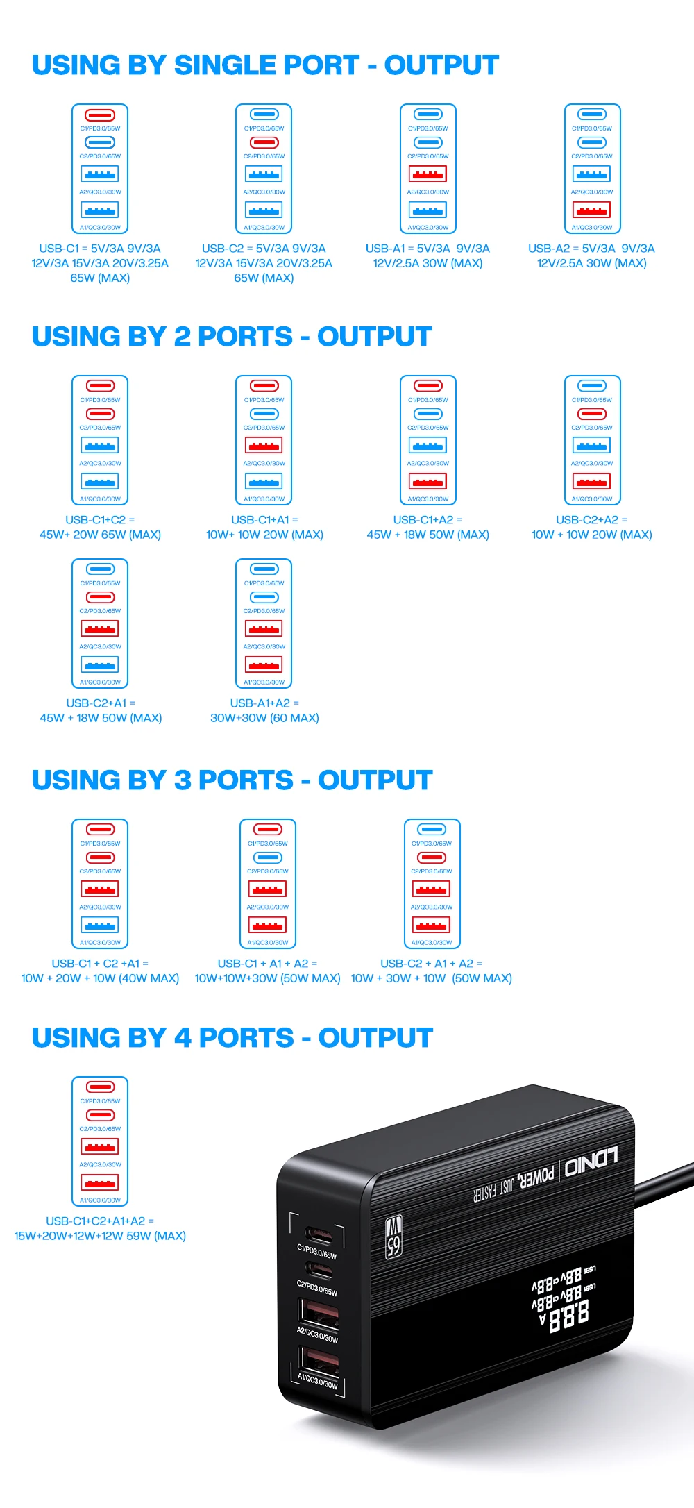 USB-C1 + A2=45W + 18W 50W (máx.)