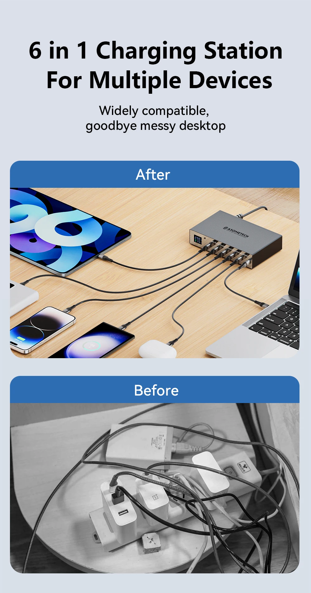 Estación de carga 6 en 1 para múltiples dispositivosAmpliamente compatible, adiós a los desordenados de escritorio