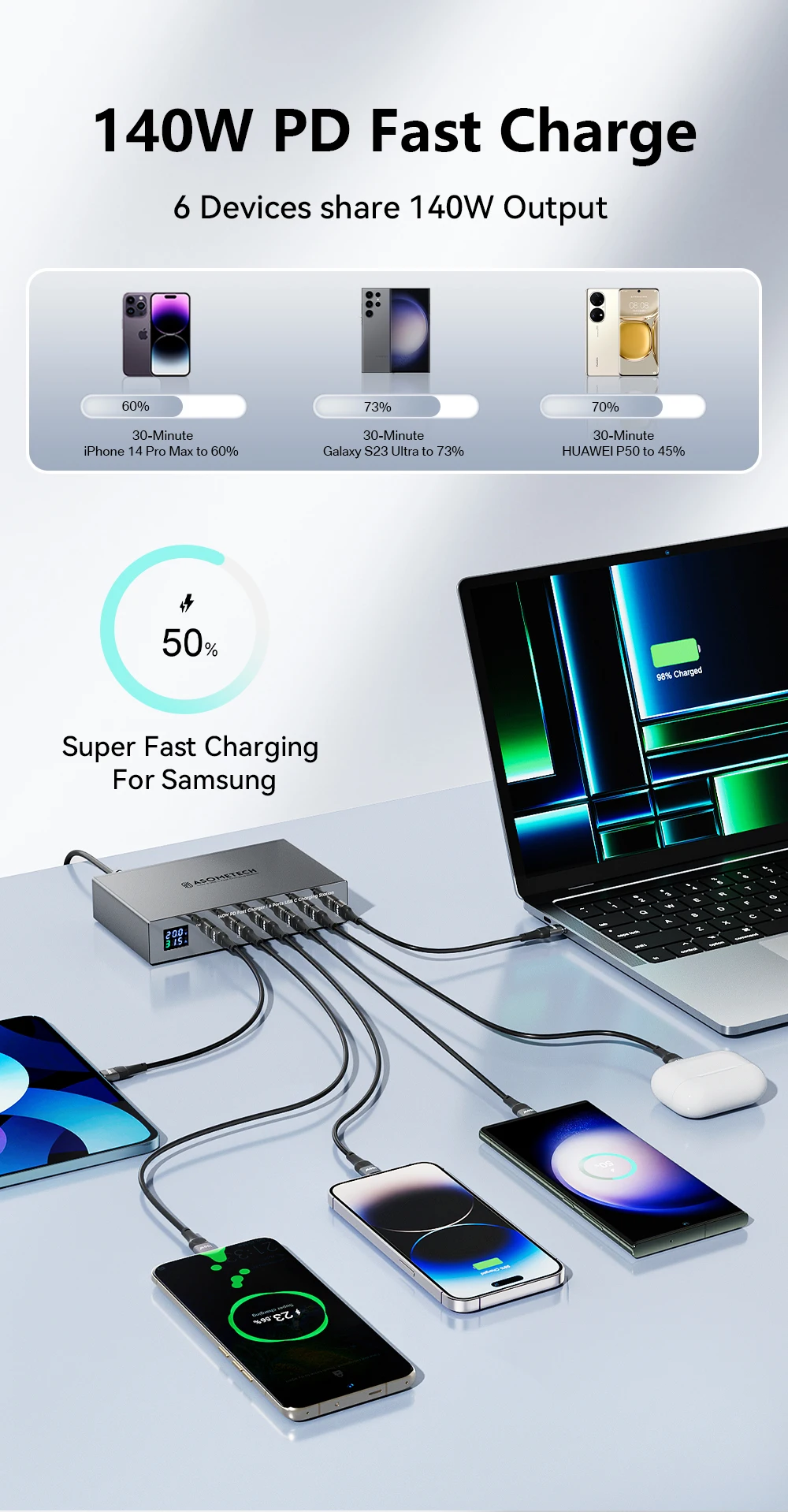 Estación de carga 6 en 1 para múltiples dispositivosAmpliamente compatible, adiós a los desordenados de escritorio