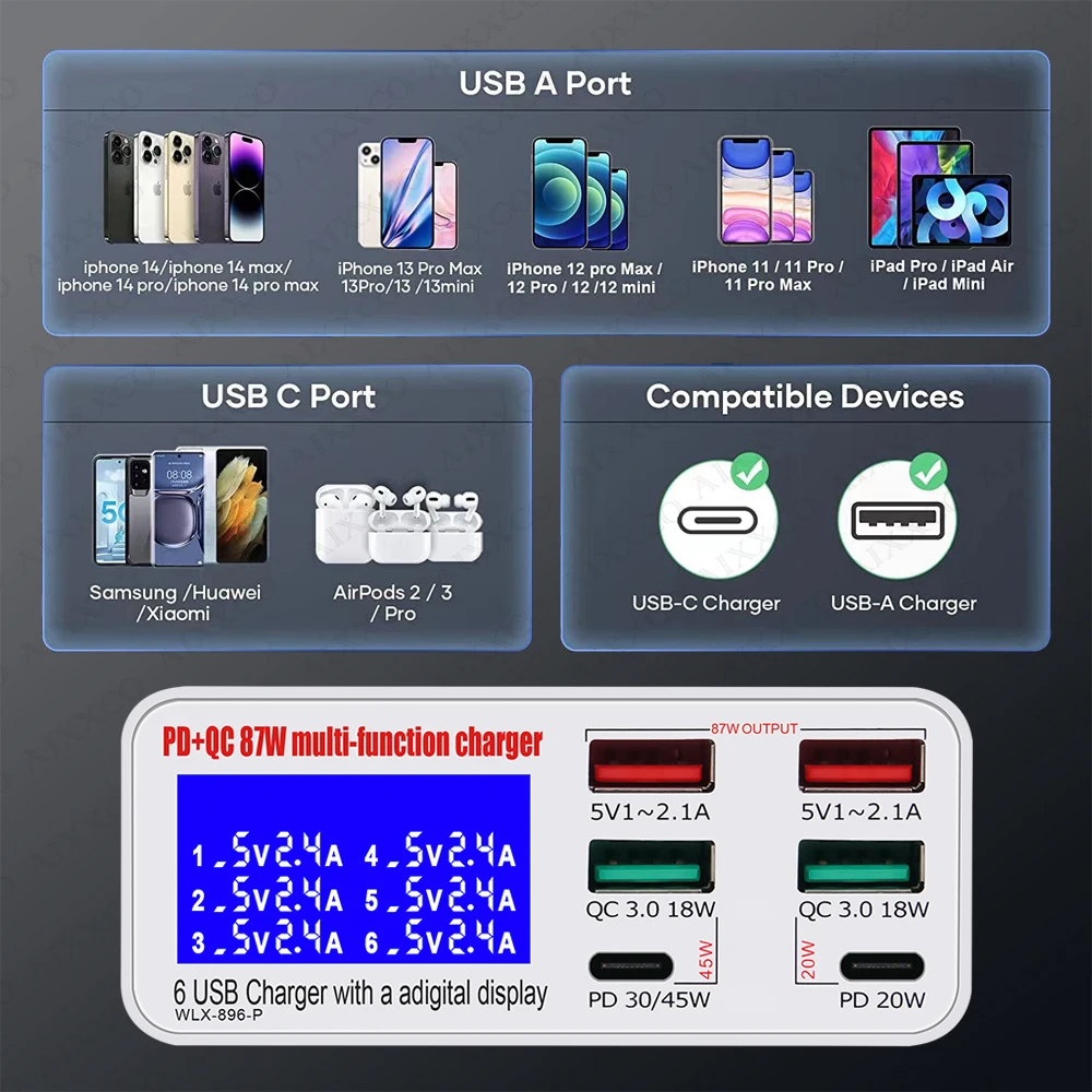 Nombre del producto: cargador con pantalla independiente de 6 puertos (2*2, 2 * QC3.0, 2 * PD).
