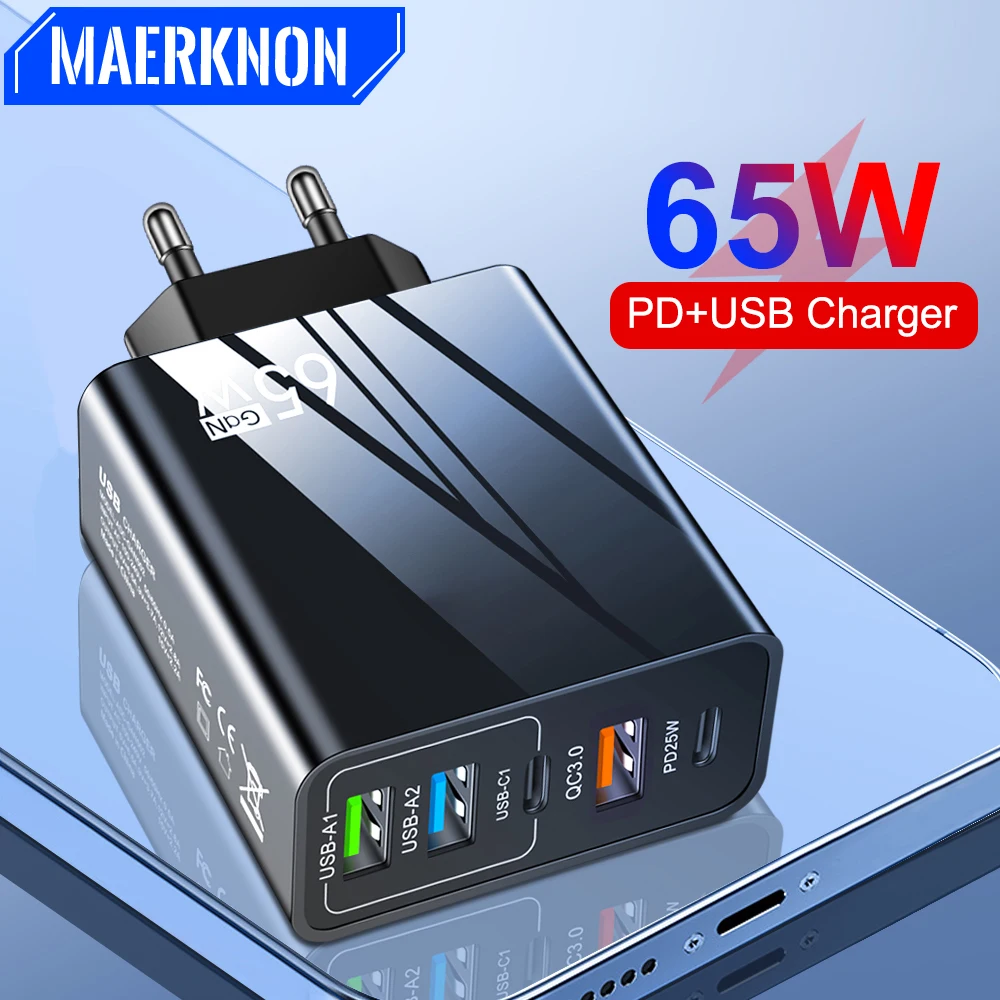 Comprar Cargador rápido USB de 5 puertos, adaptador de pared tipo C PD de 65W para iPhone 15, 14 Pro Max, Xiaomi, Samsung, enchufe europeo/estadounidense, cargador de teléfono GaN