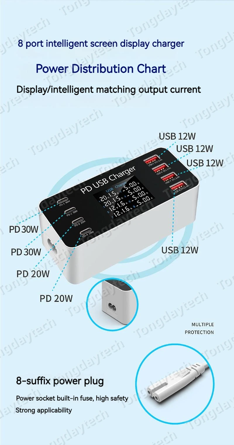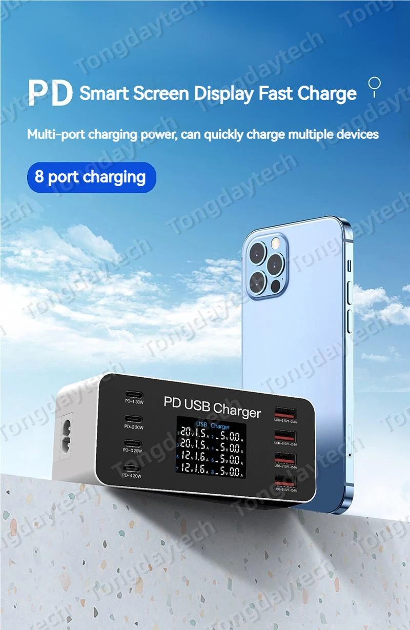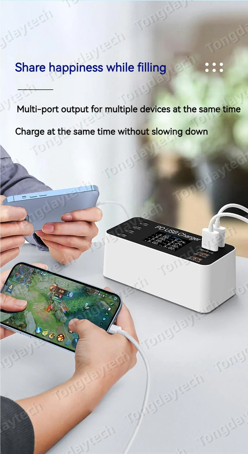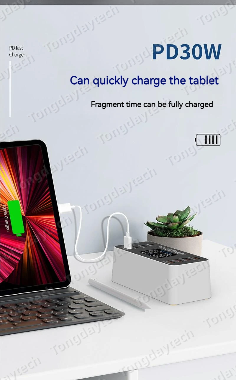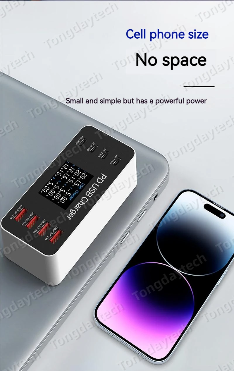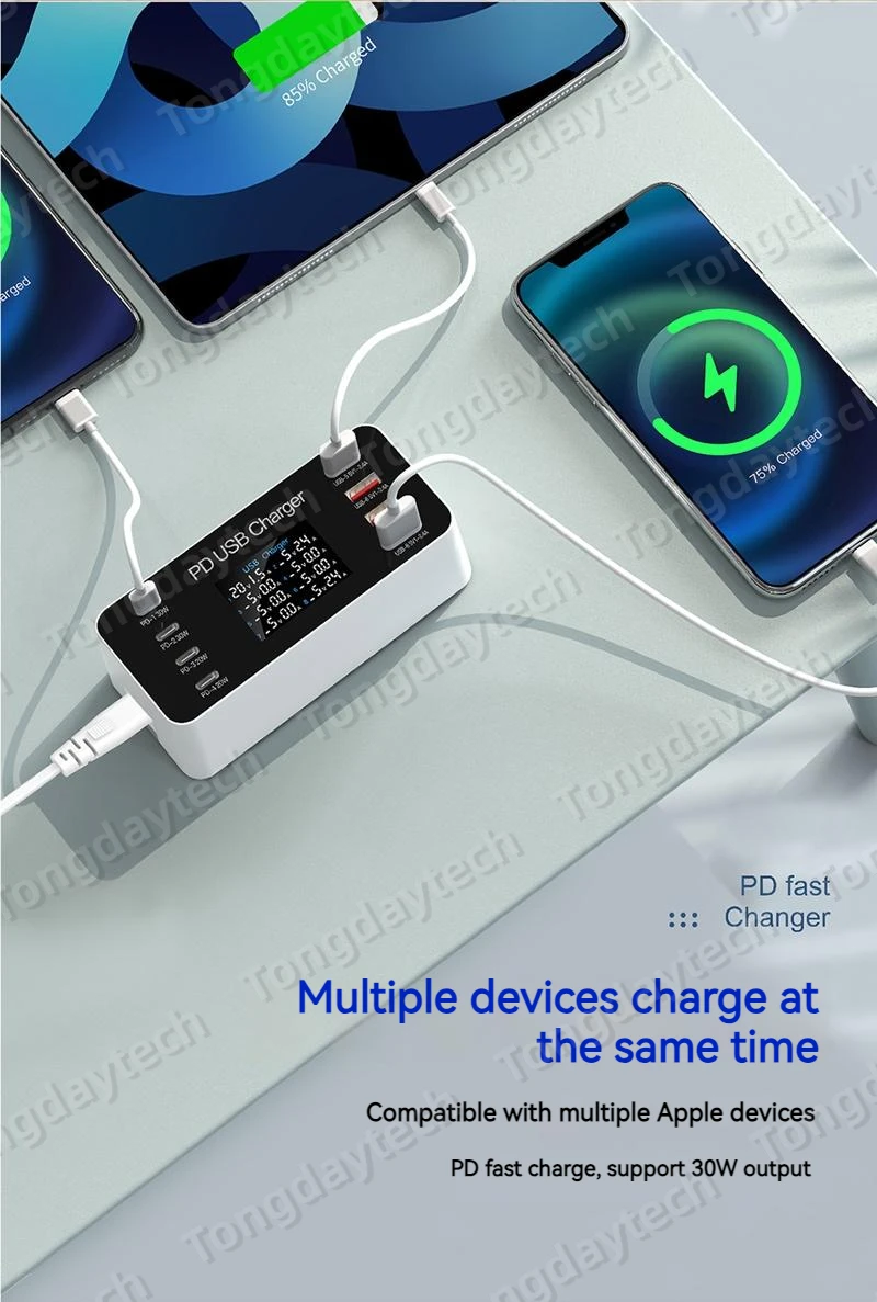 Comprar Cargador rápido USB para tableta, estación de carga de 65W, pantalla LCD, 8 puertos, PD, 30W, Iphone 14, 13, Samsung, Xiaomi