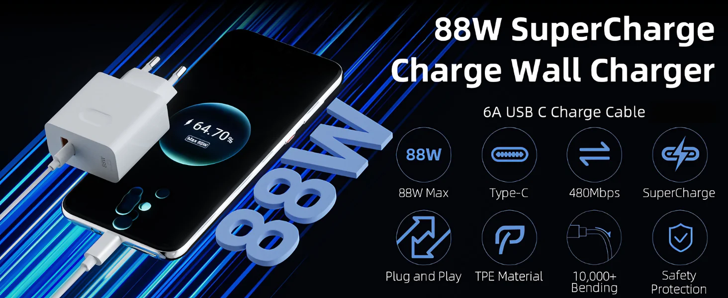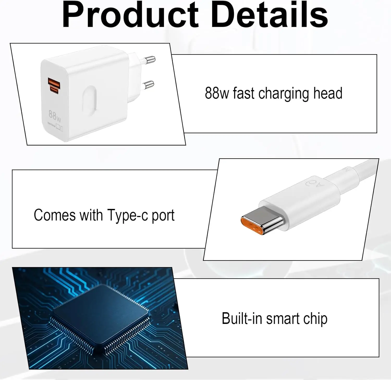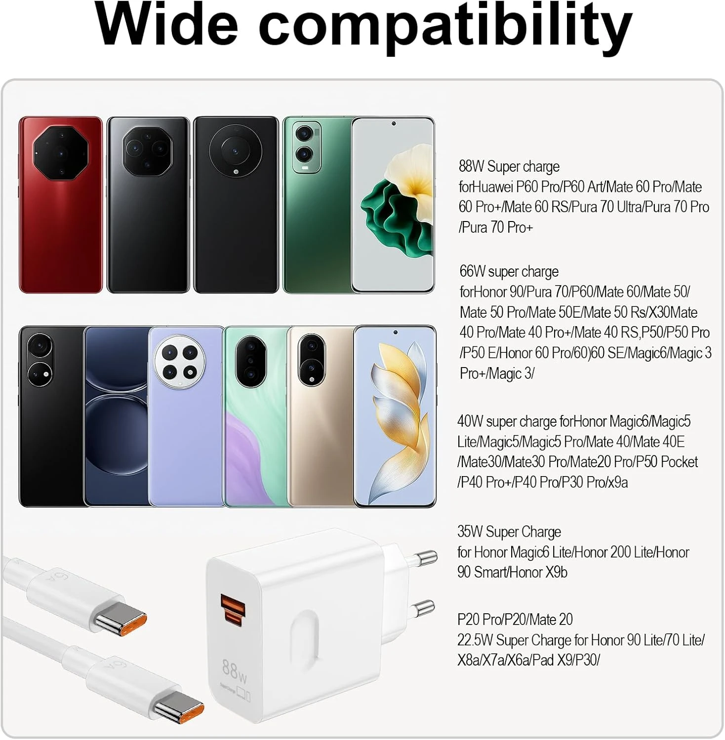 Cargador de pared súper rápido USB-A / USB-C con enchufe europeo 88W Max para Huawei Mate 50 60 70 P60 Pura 70 80 Nova 12 13 Honor 200 400 Magic 4 5 6 Pro tipo C a tipo C Cable de carga rápida 6A PD 1m 1,5 m 2m