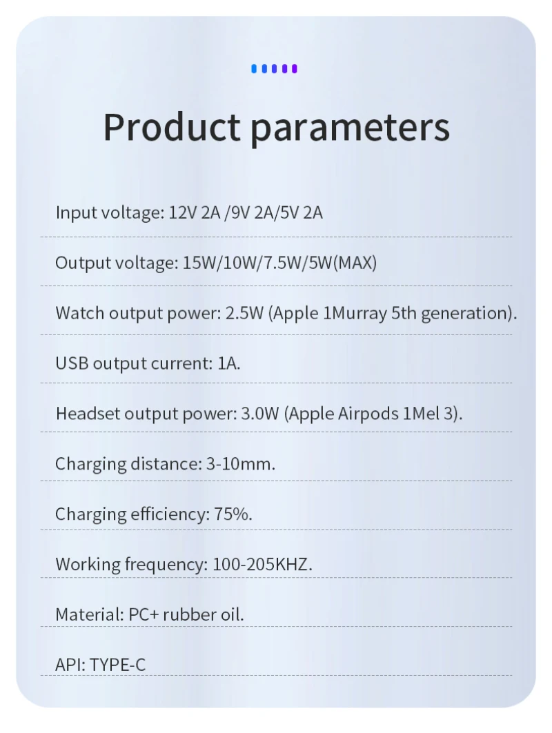 1 、 Debe usarAdaptador rápido QC3.0 por encima de 18WPara alimentar el cargador inalámbrico, la salida del puerto USB es superior a 5V/3A o 9V/2A.