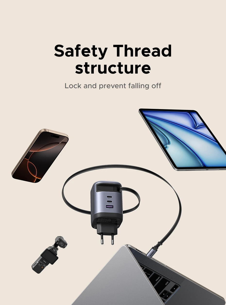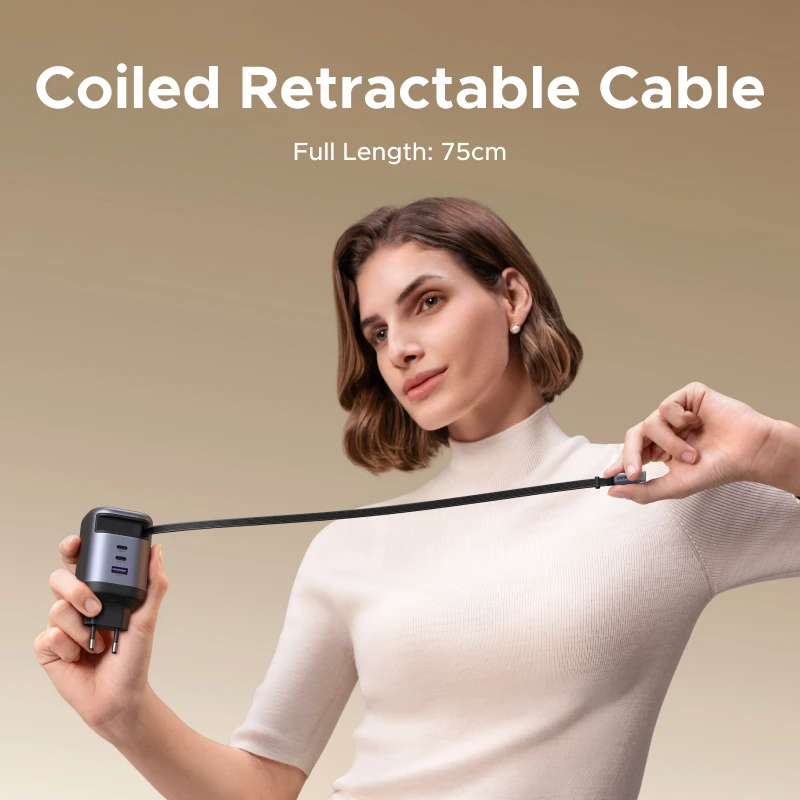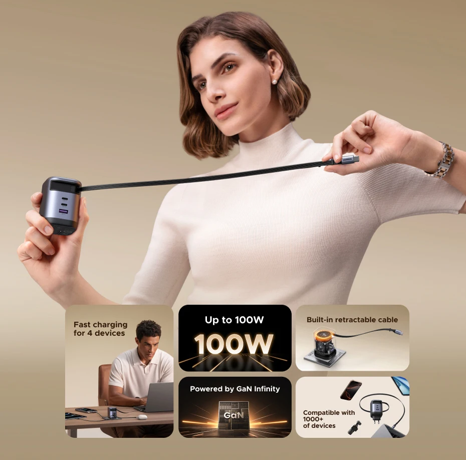 Con 1 cable retráctil incorporado, 2 puertos USB-C y 1 puerto USB-A, este cargador GaN compacto ofrece carga rápida para hasta 4 dispositivos simultáneamente. ¡Un cargador, total comodidad!