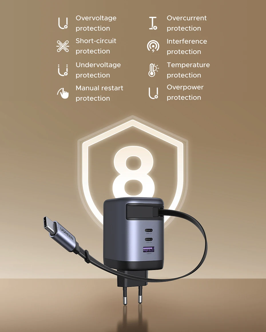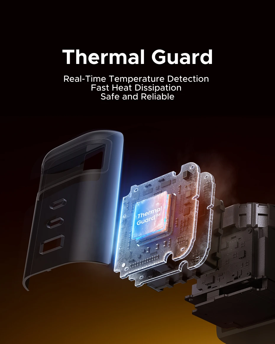 Con protección inteligente de 8 capas contra sobretensión, sobrecorriente, sobrecalentamiento y cortocircuito, este cargador utiliza tecnología innovadora GaNInfinity para lograr una eficiencia de conversión de energía del 95%, lo que reduce significativamente la generación de calor y mantiene una carga estable y de alta velocidad.