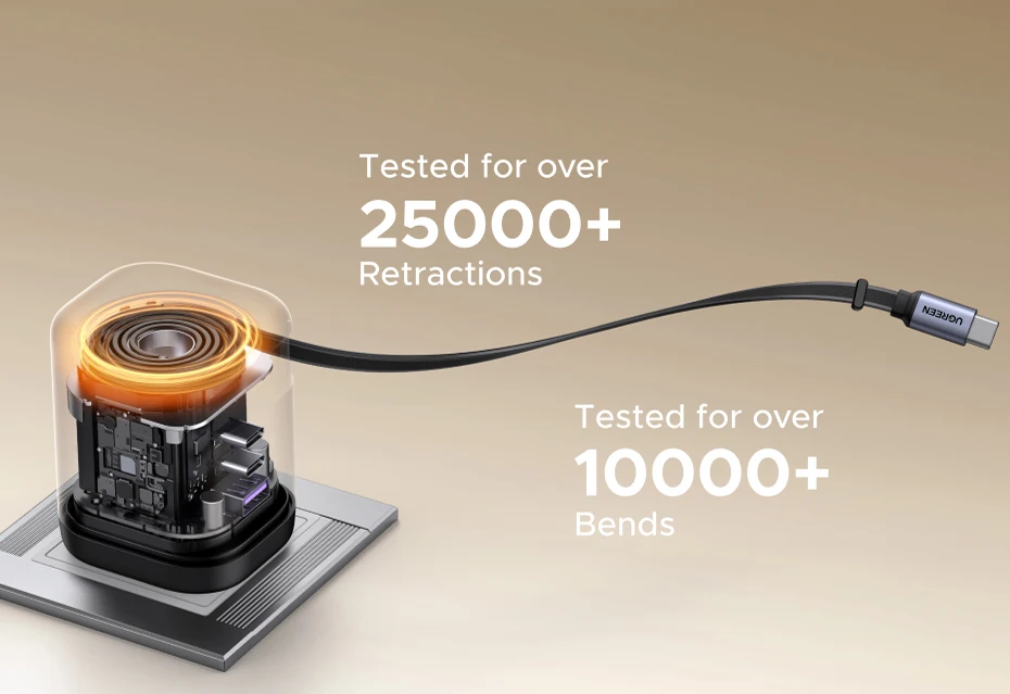 Este cargador de 100 W cuenta con un cable de carga rápida retráctil incorporado de 0,75 m: tire para extenderlo y enchufarlo para obtener energía instantánea.No más cables enredados ni cables olvidados, lo que lo hace perfecto para viajes, trabajo o uso doméstico.