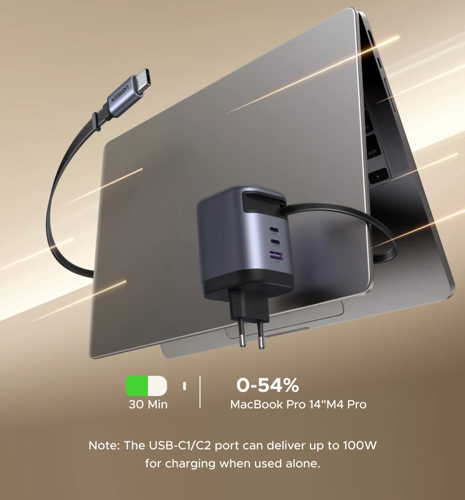Ofrece una salida increíblemente rápida de 100 W a través de puertos USB-C (dispositivo único), cargando un MacBook Pro 14" M4 Pro hasta un 54 % en 30 minutos. El cable en espiral retráctil (75 cm de longitud completa) elimina problemas de desorden y portabilidad.