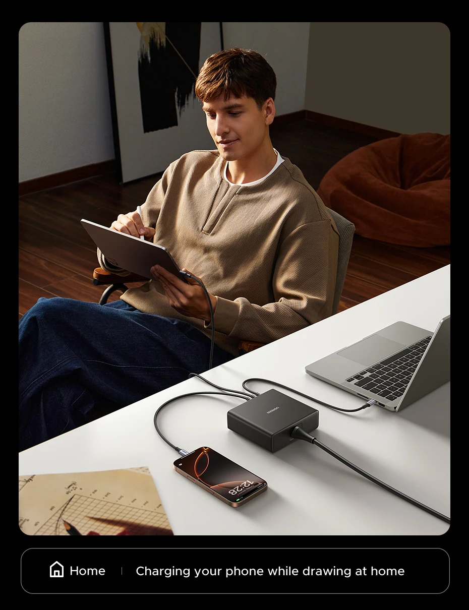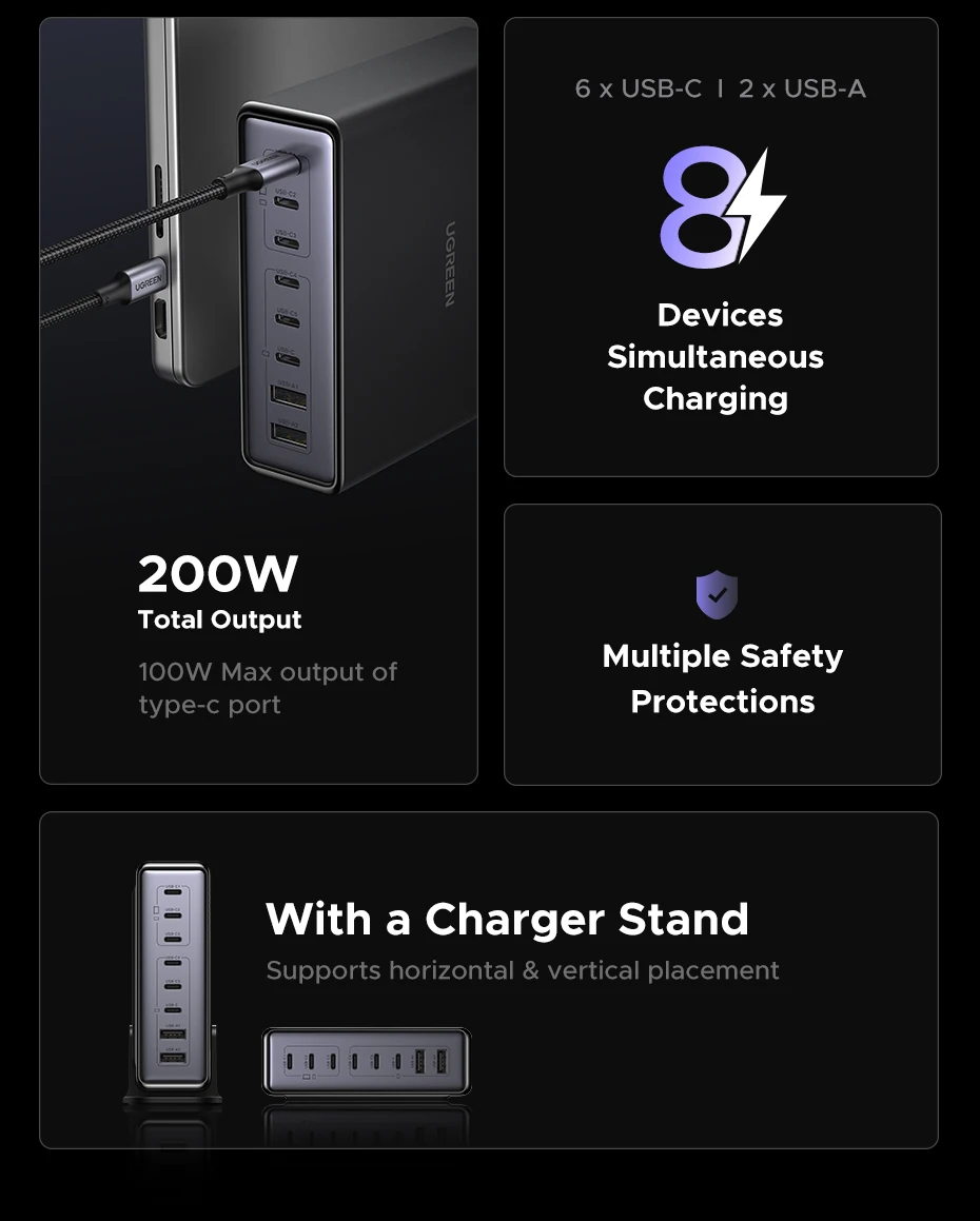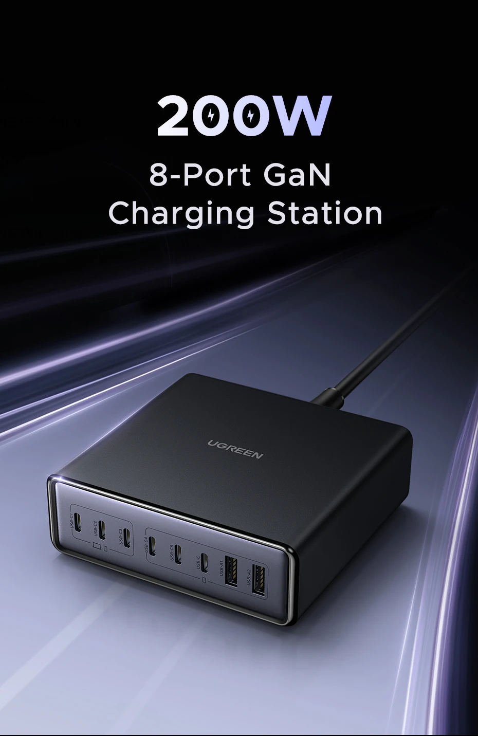 UGREEN Cargador GaN de 200W 8 en 1 Soporte de Carga Rápida para Escritorio y Portátil para iPhone 16 15 Pro Max MacBook Air Xiaomi Samsung Tablet Carga Súper Rápida Funciona Bien