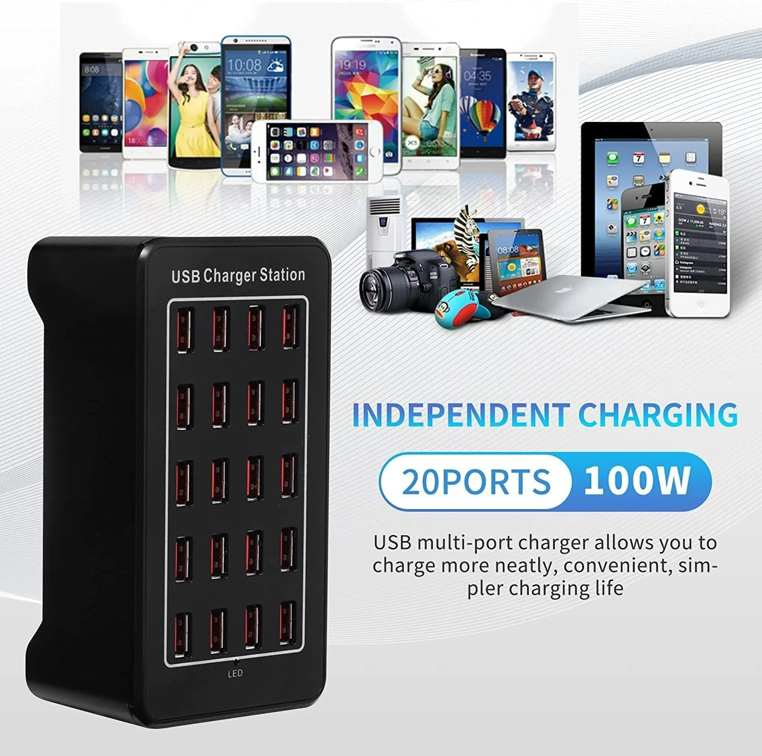 ⚡【Cargador USB de 20 puertos】: 20 puertos USB con potencia de hasta 100 W, pueden cargar 20 dispositivos diferentes al mismo tiempo, resolviendo la situación incómoda (permite una velocidad de carga de hasta 20 amperios entre 20 puertos o 2,4 amperios por puerto).que no haya suficientes enchufes al cargar varios dispositivos.No se necesitan otros adaptadores ya que el dispositivo se puede cargar con un solo cable USB.