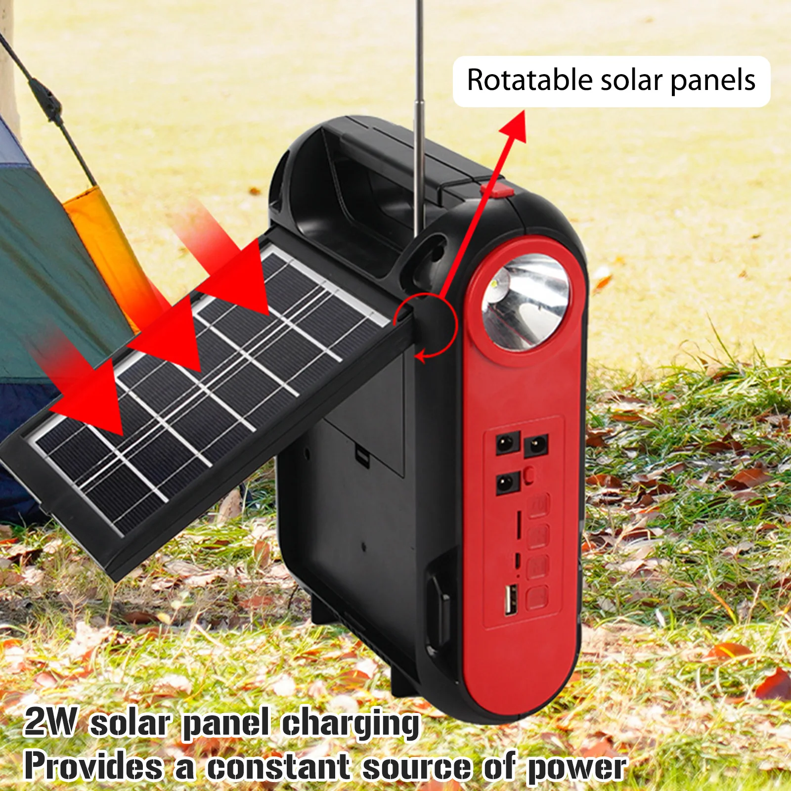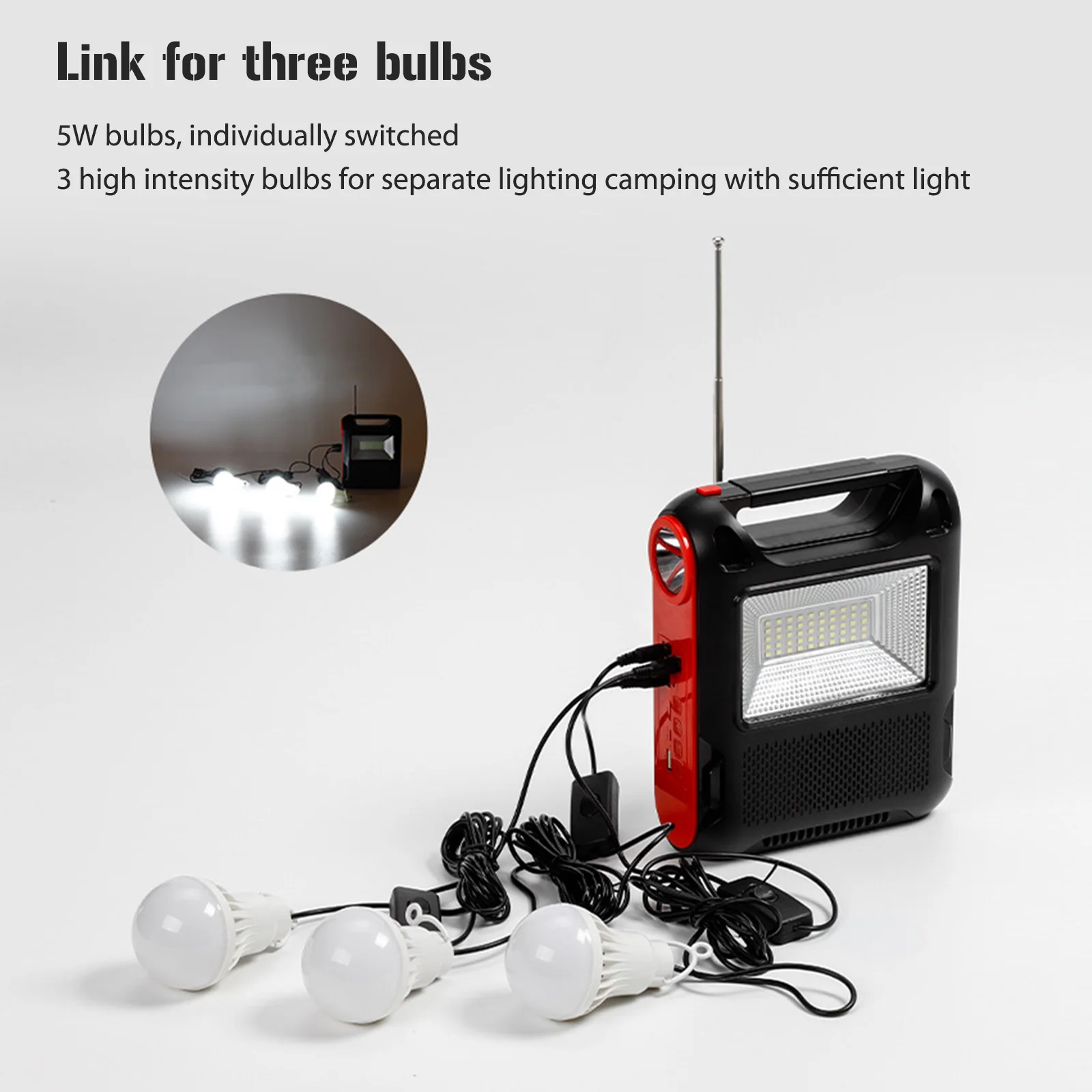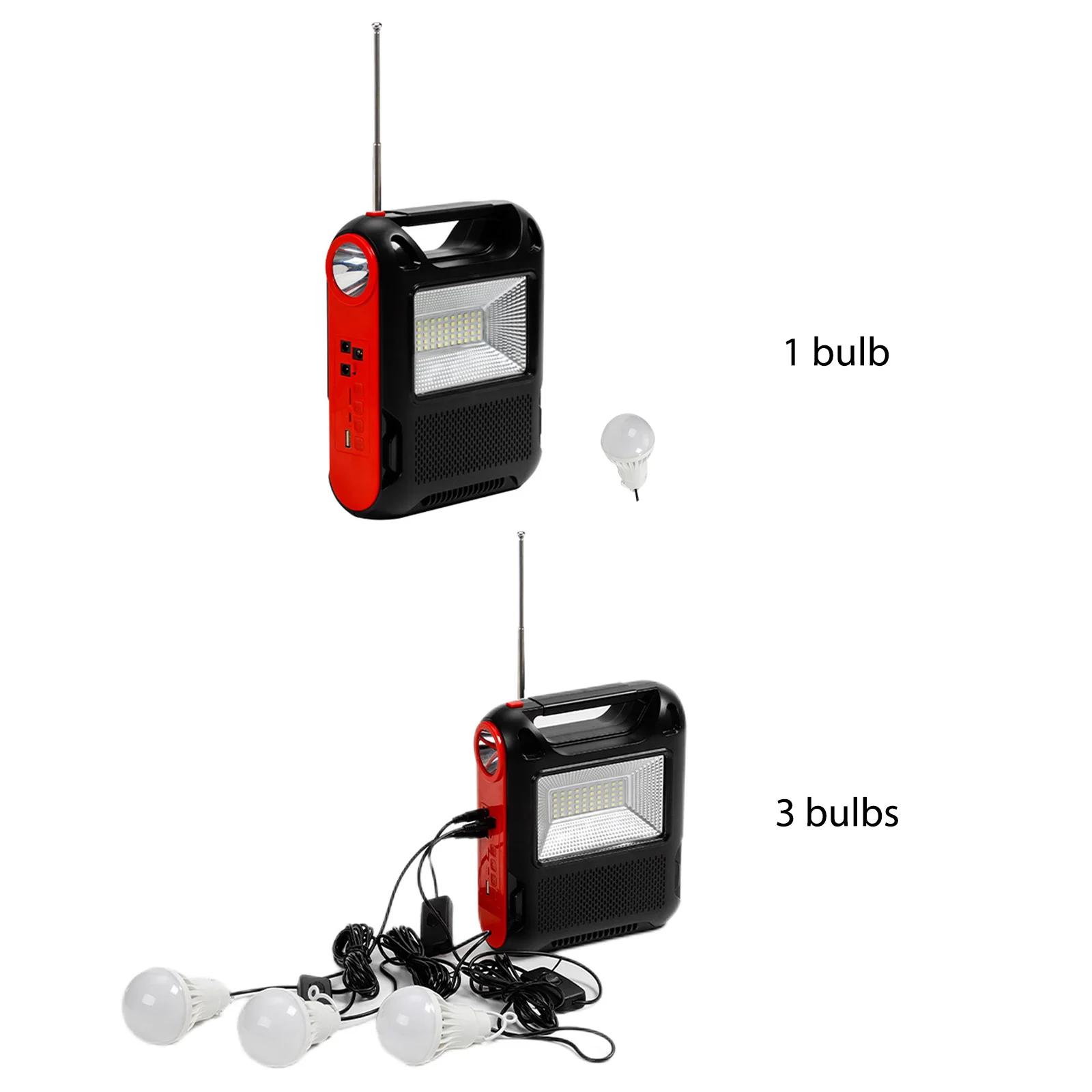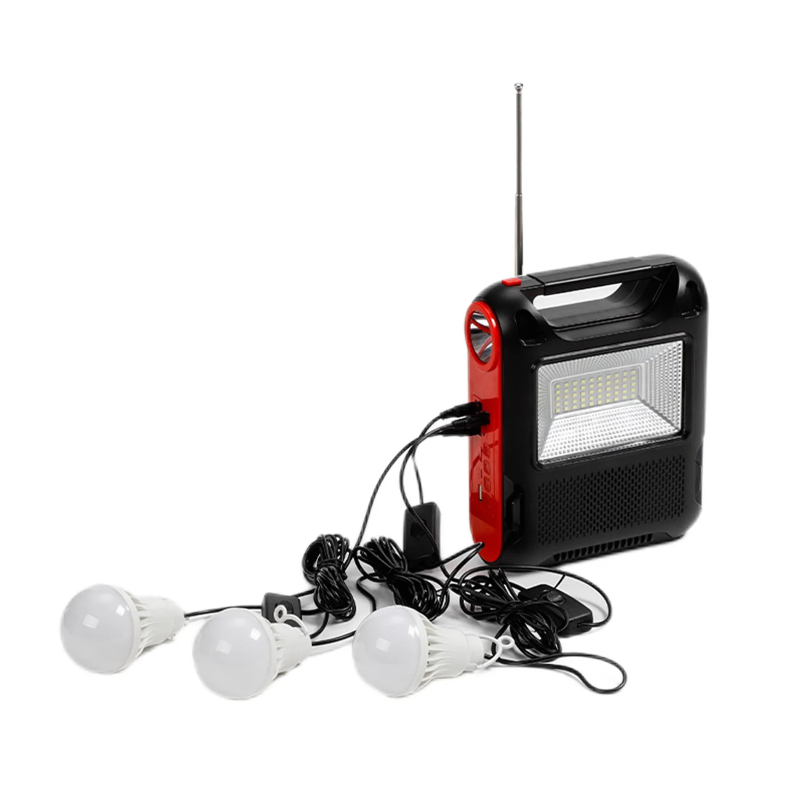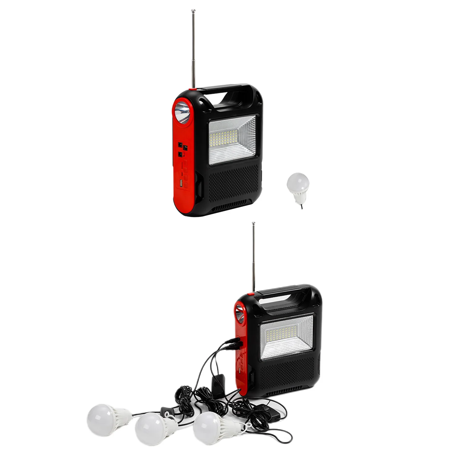Feature: 1. Solar Power Generation: The reusable solar generator can be charged with solar energy, which is environmentally friendly and energy-saving, and can be used in sunny places. 2. Power Bank: You can use the built-in large-capacity battery to easily charge electronic products, as well as mobile phones, MP3, MP4, digital cameras and other electronic products. 3. LED Light: White LED lighting and lighting, low power consumption, higher brightness, more durable use, constant current integrated circuit drive, good stability. 4. Application: Ideal for indoor lighting, outdoor lighting, power outages, camping, home lighting and areas without electricity. 5. Multi-function: Equipped with radio function (FM radio). With Flashlight and floodlight. Specification: Function: Built-In Speaker,Flashlight Type: FM Style: Portable Model Number: Emergency Radio Power Supply: Rechargeable Battery Pack Bluetooth-compatible: Yes Audio input: Bluetooth-compatible V5.1 + call + U disk + TF card + AUX + radio antenna + two couplets Function: Solar automatic charging (122x135) Flashlight Lighting Floodlight Speaker power: Diameter52 5W Bluetooth-compatible Specifications: 5.1 Jerry Working time: about 2-4 hours Wireless reception range: 10 meters Lamp beads: 1W030 bright lamp beads Floodlight: 18W DC bulb: 5W 2.7 meters long Battery capacity: 18650/(1200 MAH*3 sections total 3600MAH) Product size: About 168x75x215MM/6.61x2.95x8.46in Color box size: About 173x79x282MM/6.81x3.11x11.1in Product net weight: 0.709KG Gross weight: 0.885KG Material: ABS plastic Style: A: 1 Battery+1 Bulb+1 Radio; B: 3 Battery+3 Bulb+1 Radio Note: 1/3 x Bulb 1 x Radio ![]() ![]() ![]() ![]() ![]() ![]() ![]() ![]() ![]() ![]() ![]() ![]() ![]() ![]() |