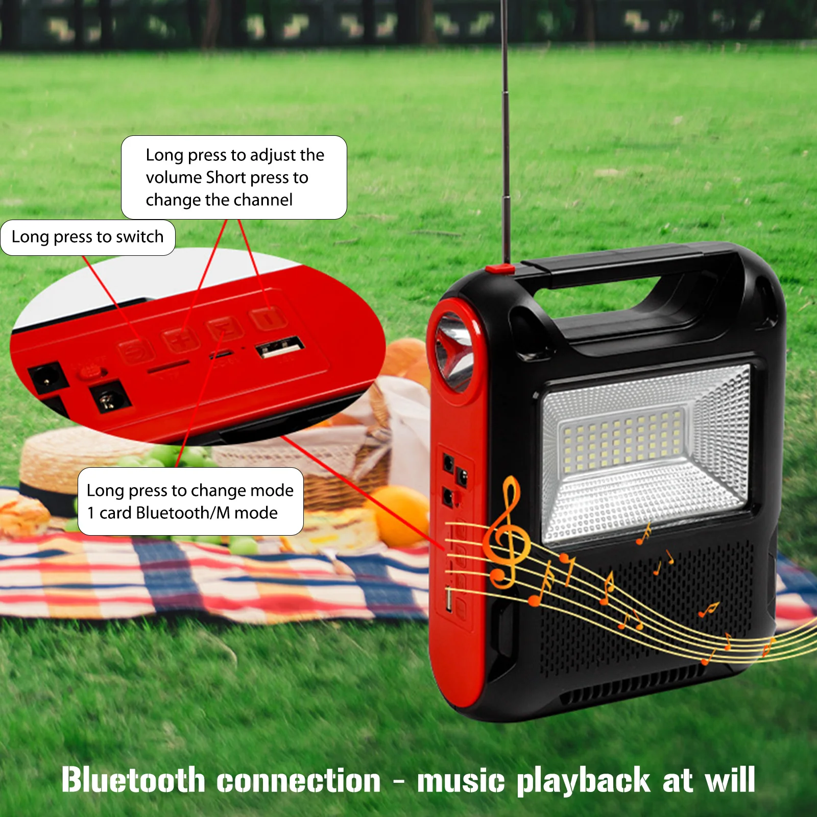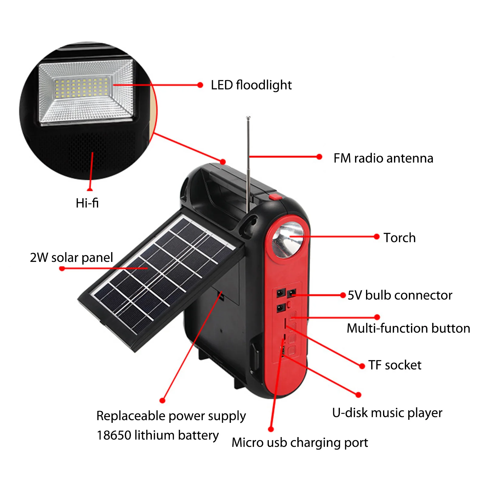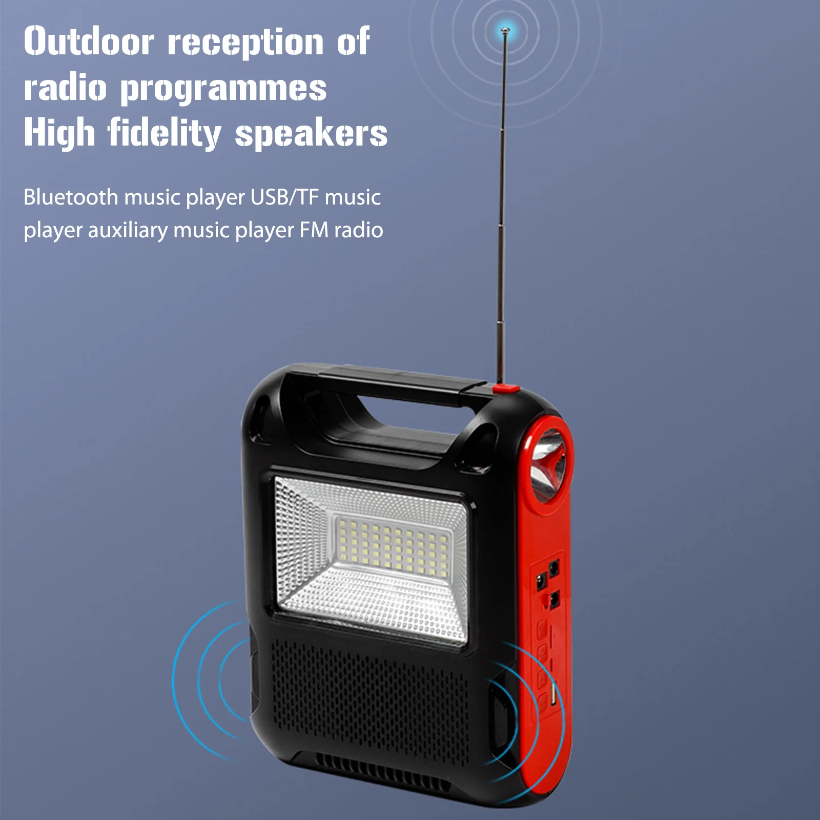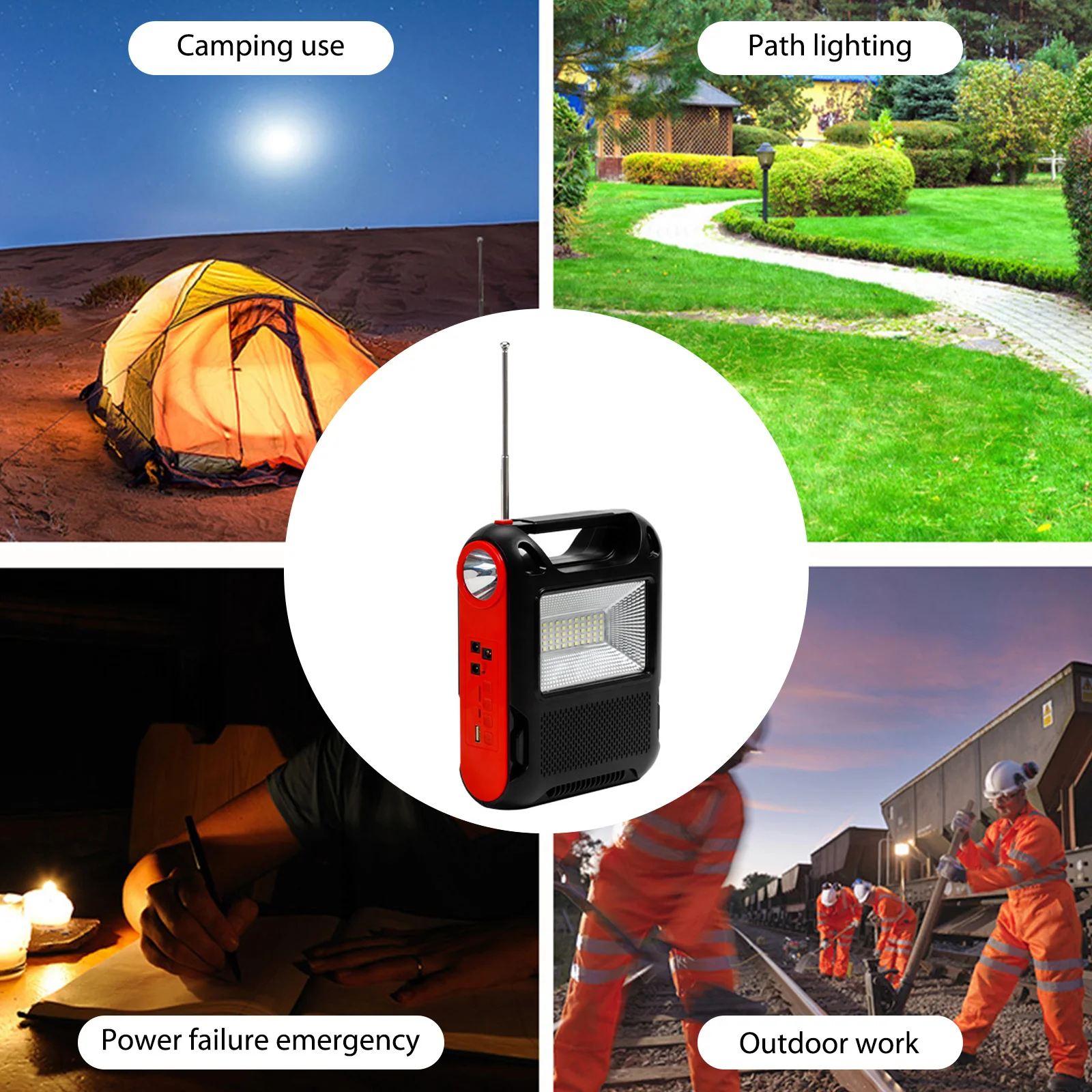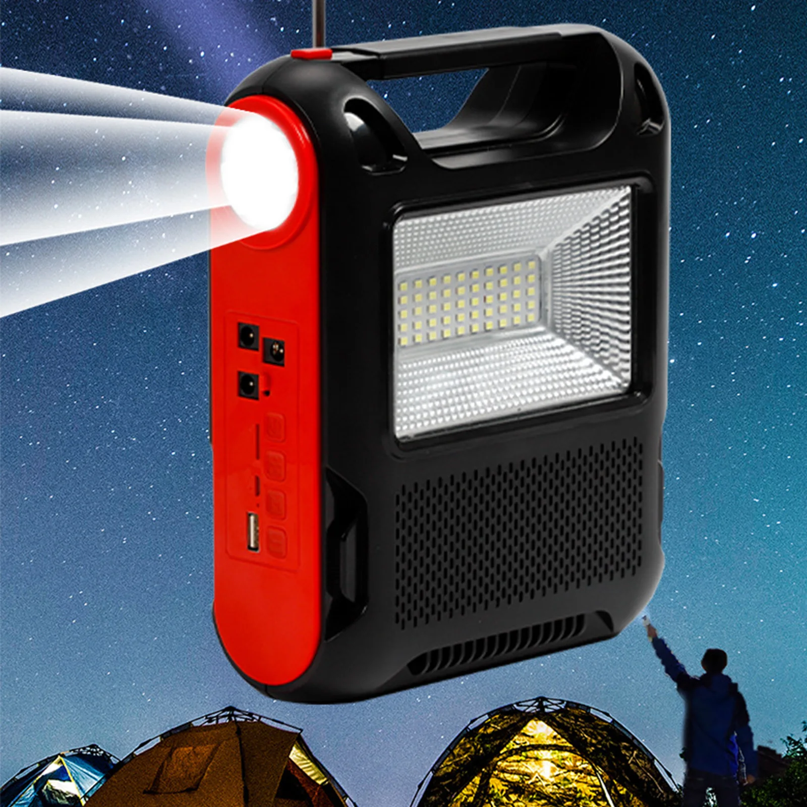 Feature: 1. Solar Power Generation: The reusable solar generator can be charged with solar energy, which is environmentally friendly and energy-saving, and can be used in sunny places. 2. Power Bank: You can use the built-in large-capacity battery to easily charge electronic products, as well as mobile phones, MP3, MP4, digital cameras and other electronic products. 3. LED Light: White LED lighting and lighting, low power consumption, higher brightness, more durable use, constant current integrated circuit drive, good stability. 4. Application: Ideal for indoor lighting, outdoor lighting, power outages, camping, home lighting and areas without electricity. 5. Multi-function: Equipped with radio function (FM radio). With Flashlight and floodlight. Specification: Function: Built-In Speaker,Flashlight Type: FM Style: Portable Model Number: Emergency Radio Power Supply: Rechargeable Battery Pack Bluetooth-compatible: Yes Audio input: Bluetooth-compatible V5.1 + call + U disk + TF card + AUX + radio antenna + two couplets Function: Solar automatic charging (122x135) Flashlight Lighting Floodlight Speaker power: Diameter52 5W Bluetooth-compatible Specifications: 5.1 Jerry Working time: about 2-4 hours Wireless reception range: 10 meters Lamp beads: 1W030 bright lamp beads Floodlight: 18W DC bulb: 5W 2.7 meters long Battery capacity: 18650/(1200 MAH*3 sections total 3600MAH) Product size: About 168x75x215MM/6.61x2.95x8.46in Color box size: About 173x79x282MM/6.81x3.11x11.1in Product net weight: 0.709KG Gross weight: 0.885KG Material: ABS plastic Style: A: 1 Battery+1 Bulb+1 Radio; B: 3 Battery+3 Bulb+1 Radio Note: 1/3 x Bulb 1 x Radio ![]() ![]() ![]() ![]() ![]() ![]() ![]() ![]() ![]() ![]() ![]() ![]() ![]() ![]() |